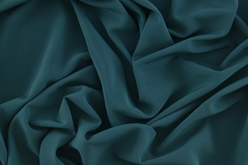 Tessuto crêpe in misto seta, leggero e vaporoso color blu petrolio. Tessuto opaco di mano crespa, dal tipico tocco ruvido.