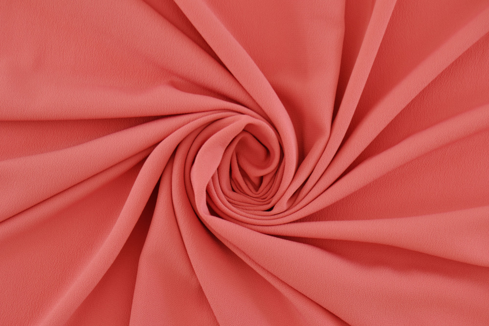 Tessuto crêpe in misto seta, leggero e vaporoso color rosa corallo. Tessuto opaco di mano crespa, dal tipico tocco ruvido. Leggermente elasticizzato.