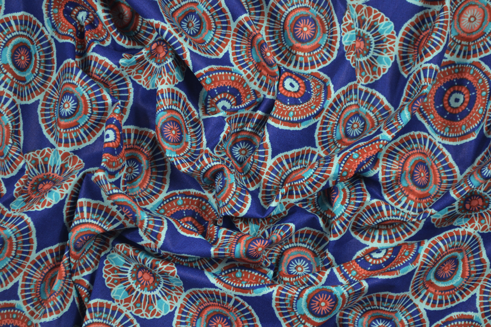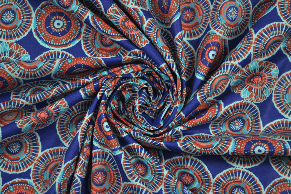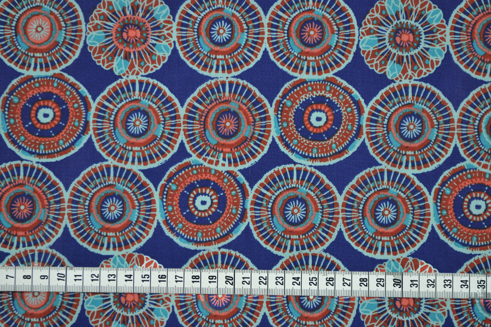 Tessuto di puro cotone con stampa a cerchi di ispirazione etnica su fondo blu.