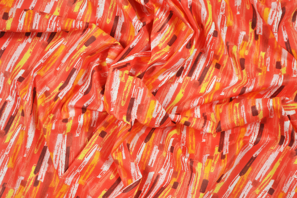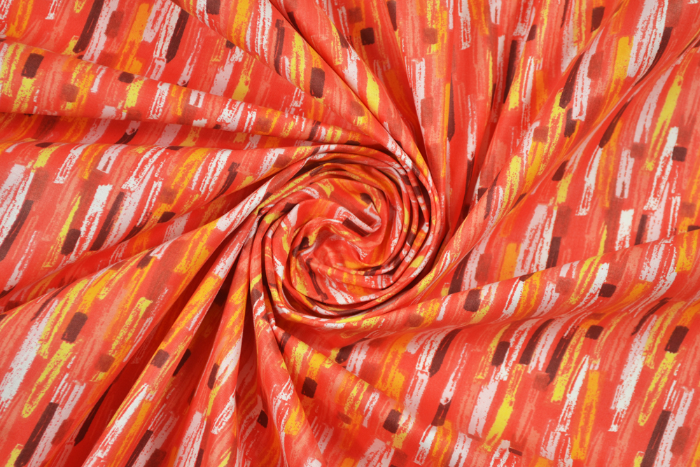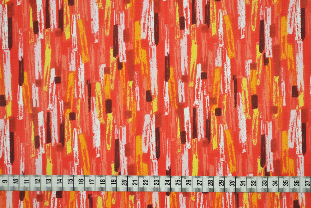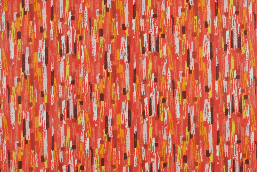 Tessuto di puro cotone con stampa astratta di pennellate in varie tonalità di rosso arancio.