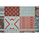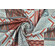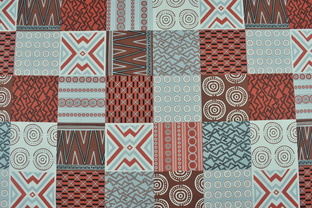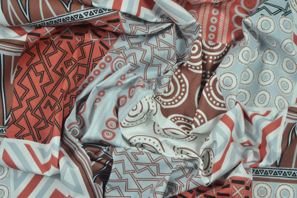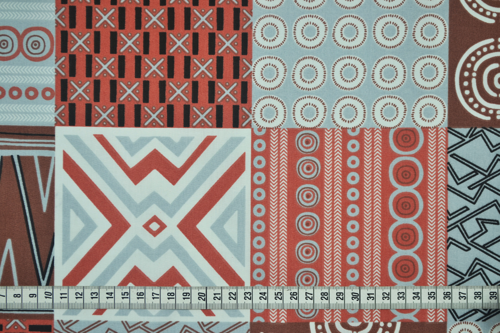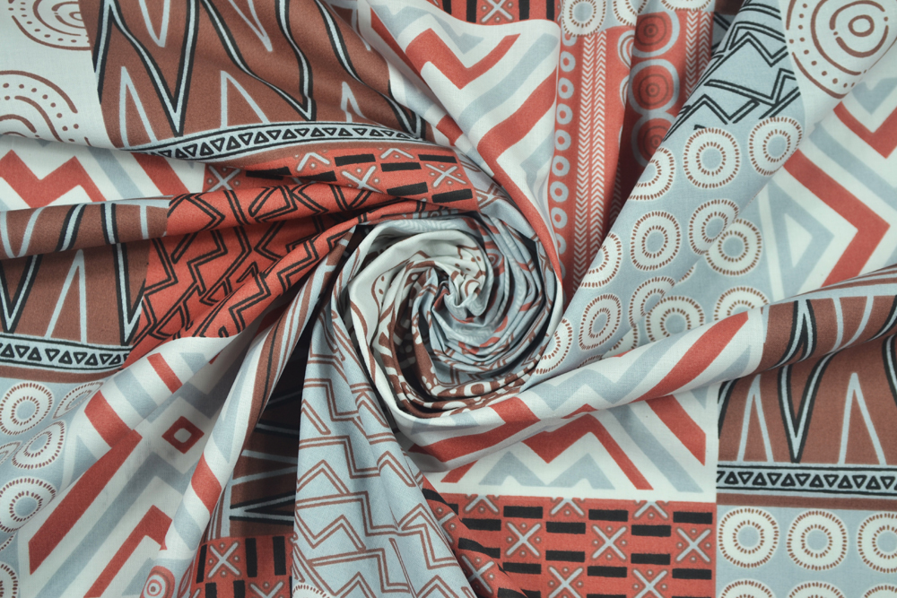 Tessuto di puro cotone con stampa geometrica di ispirazione etnica in grigio e terracotta.