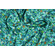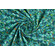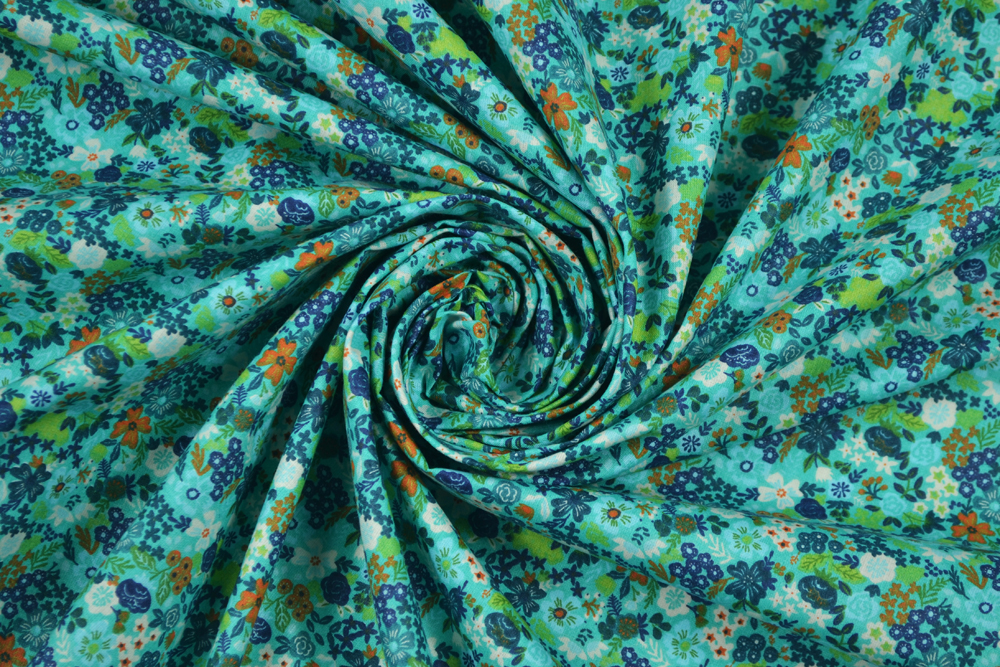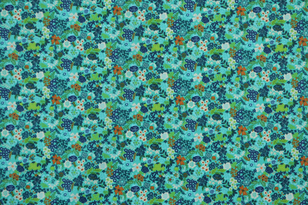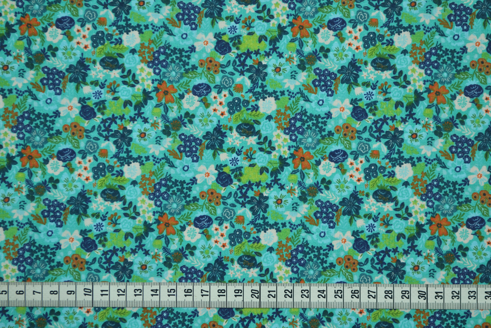 Tessuto di puro cotone con ricca stampa floreale in blu su fondo turchese.