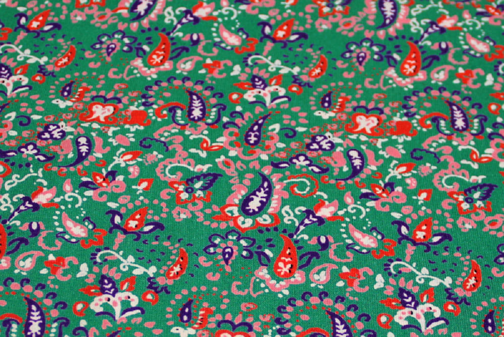 Bellissimo tessuto leggero di poliestere, di mano simile alla viscosa! Molto fluido, morbido, "vaporoso" verde con motivo orientale paisley in viola, rosso e rosa.