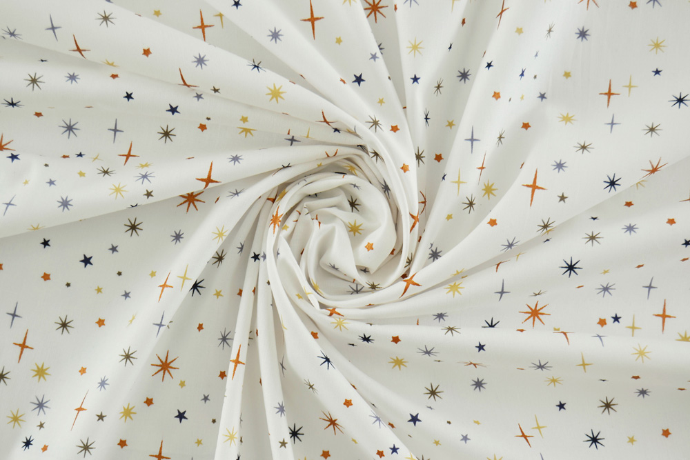 Tessuto in puro cotone bianco panna con stampa di astri e stelline in grigio, blu e dorate brillanti!