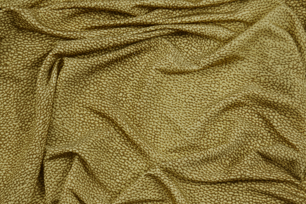 Jersey di viscosa elasticizzato maculato in marrone e marrone chiaro. Bi-elastico anche senza elastan, grazie al tipo di maglia. Molto scivoloso, fresco e confortevole.