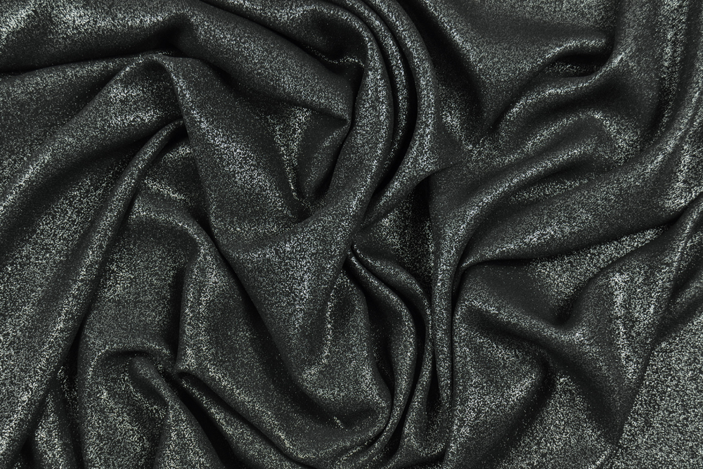 Crêpe georgette nera di poliestere, leggera e vaporosa con lato dritto argentato, effetto glitter. Rovescio nero.