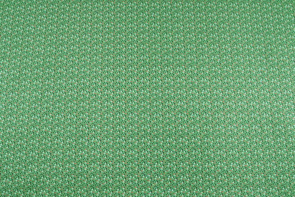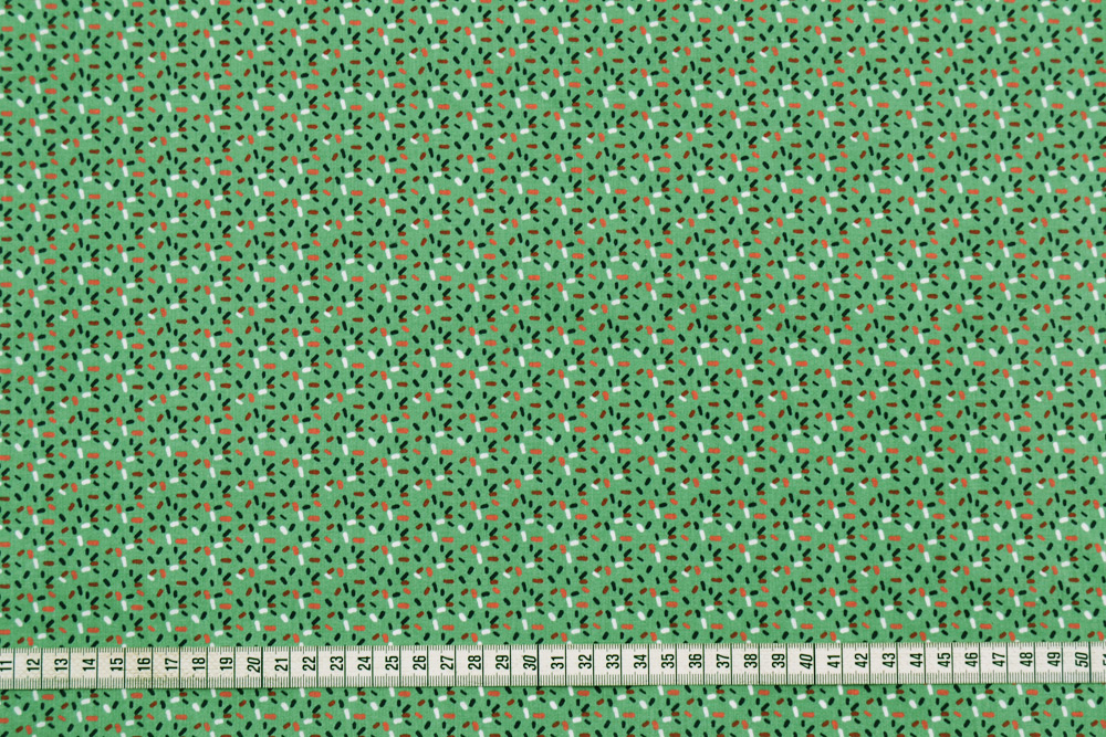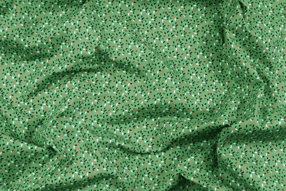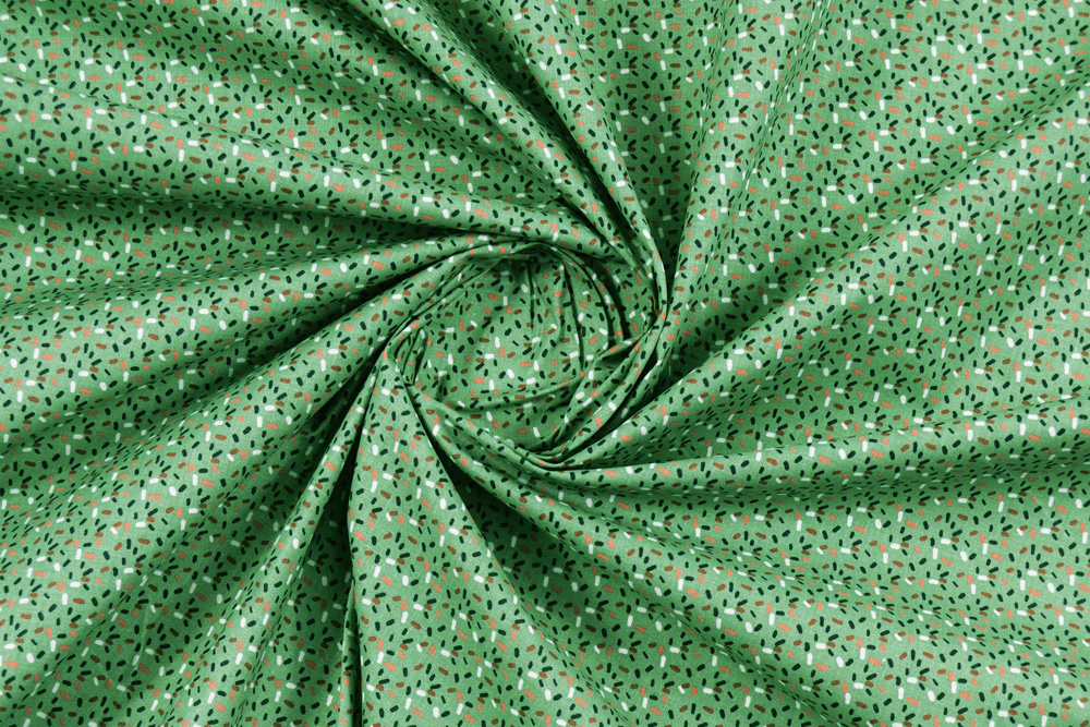Tessuto di puro cotone verde salvia, con fantasia a zuccherini colorati rossi, blu, bianchi e rosa.