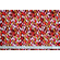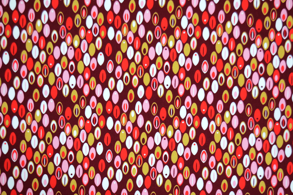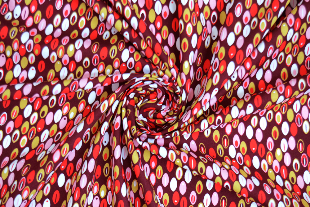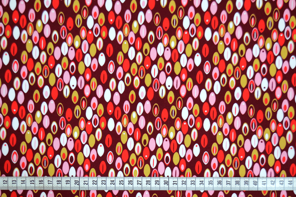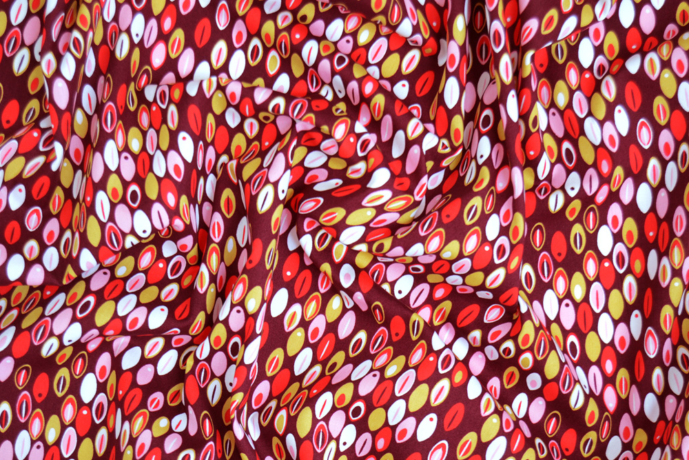 Popeline di puro cotone bordeaux scuro con stampa a ovali, o pois allungati, in rosa, rosso, bianco e verde oliva.