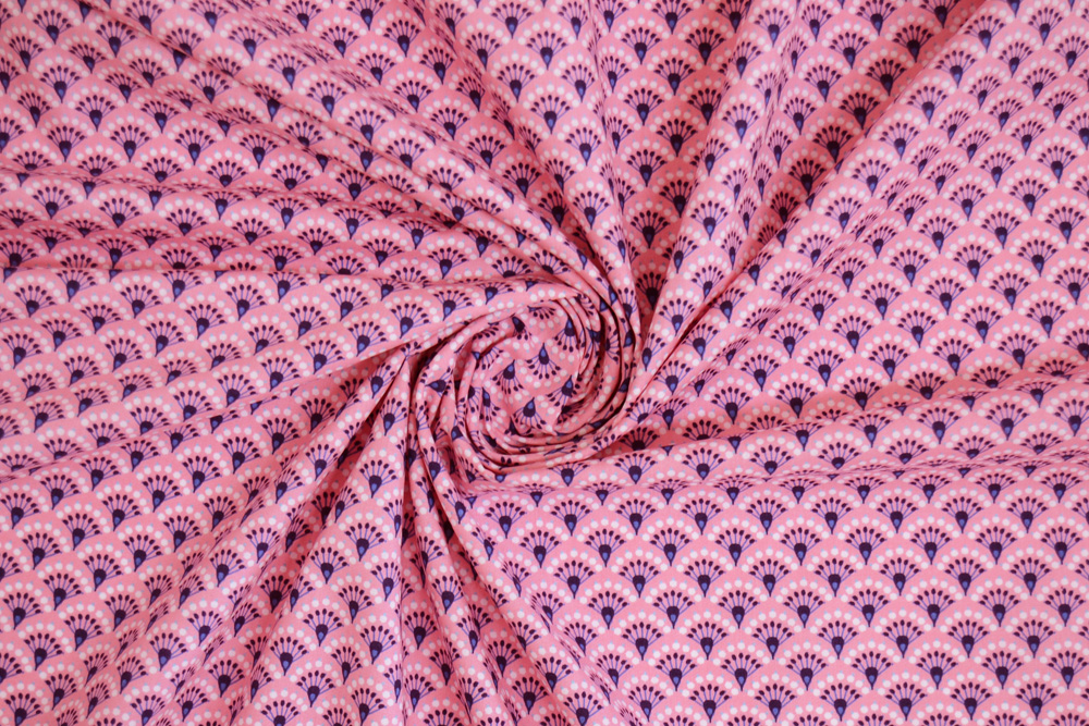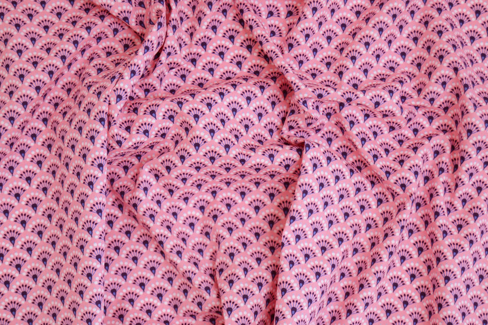 Popeline di puro cotone rosa con stampa di motivi a ventagli.