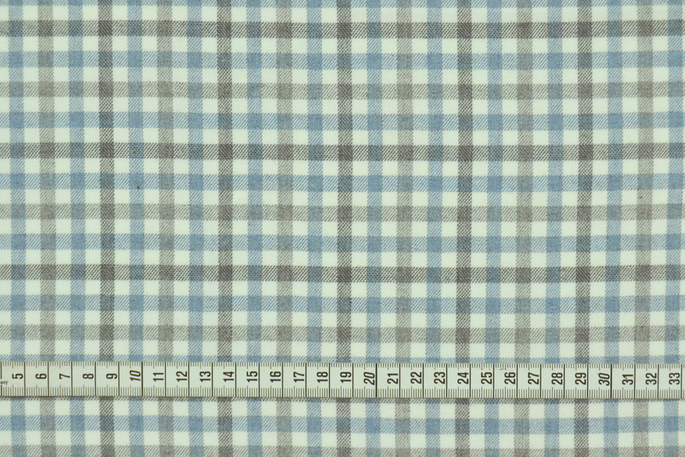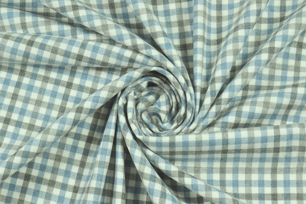 Flanella di cotone di ottima qualità e provenienza, a quadri in azzurro e grigio su fondo bianco. Tessuto flanella con grammatura da pantaloni, molto morbida e piacevole al tatto!