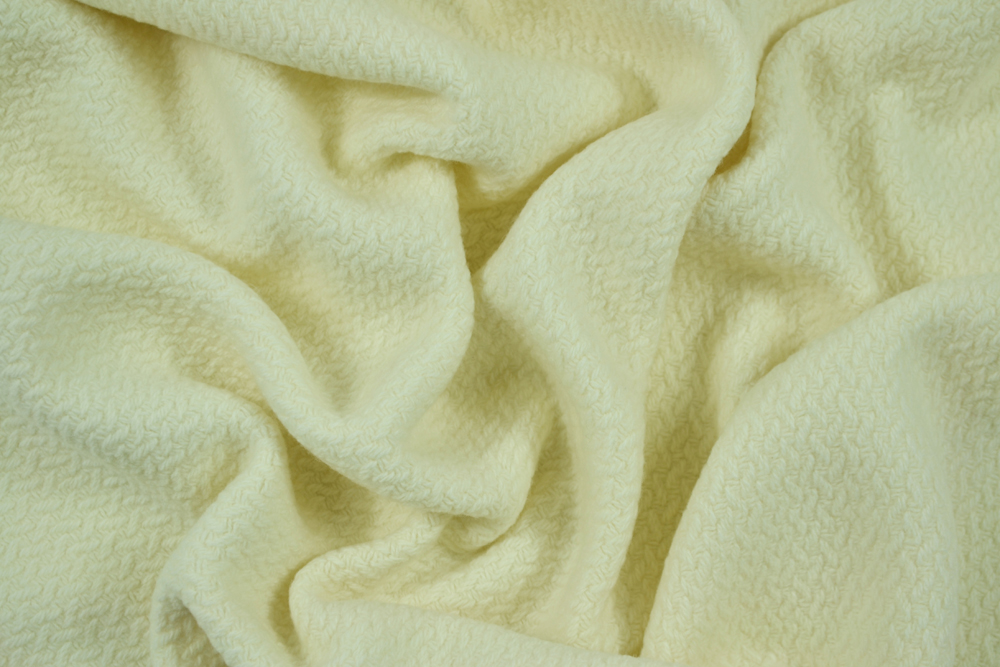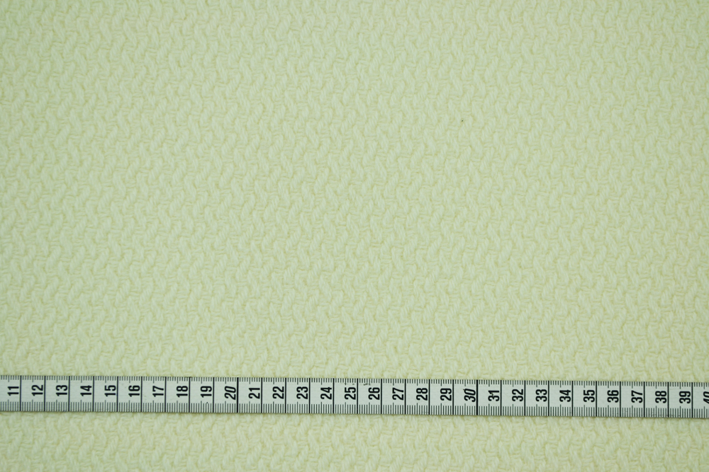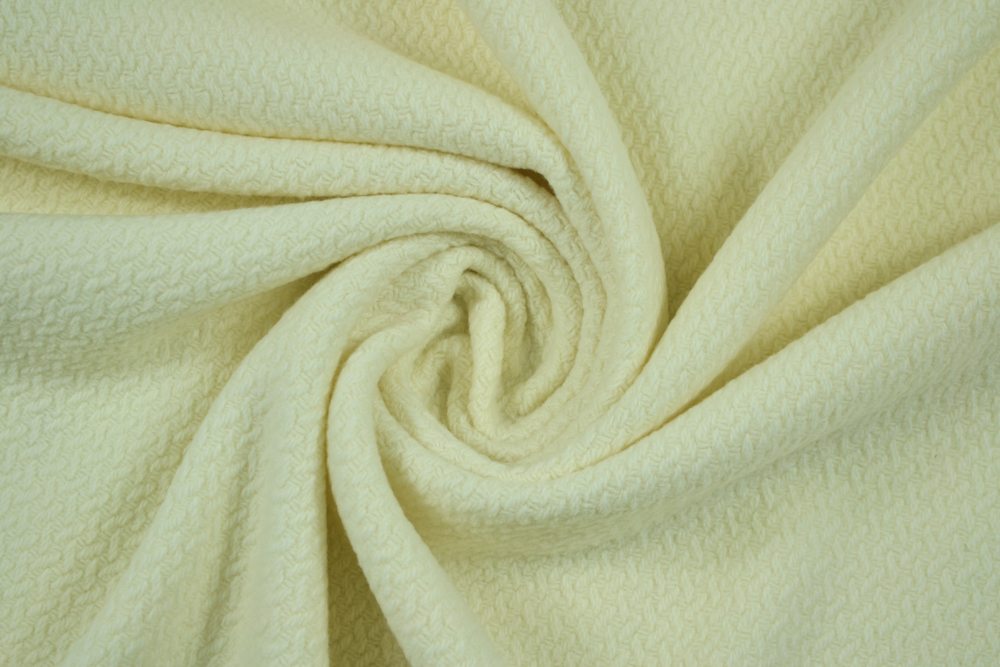 Tessuto in misto lana color bianco panna, realizzato con filati grossi, ben in rilievo, che formano un motivo ad incrocio.