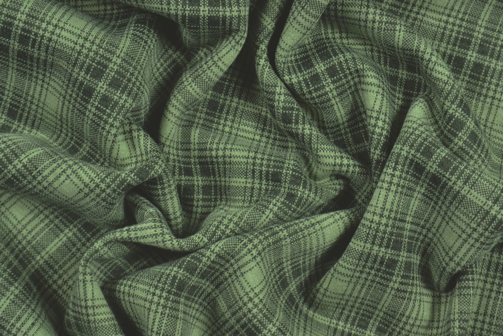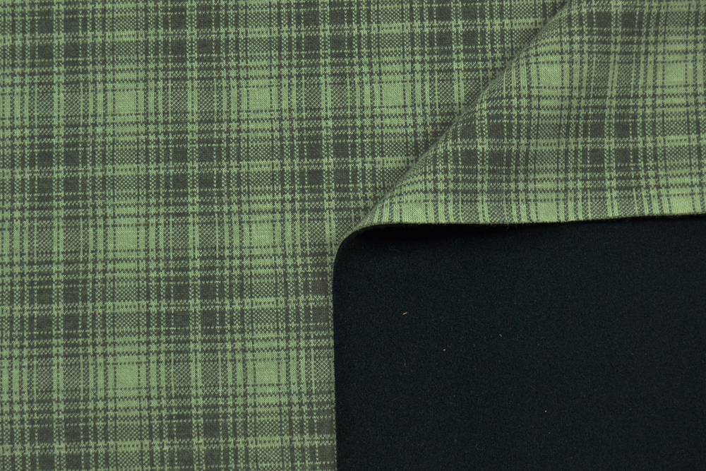 Tessuto double face con fantasia a quadri verde pistacchio sul dritto e micropile nero sul rovescio.