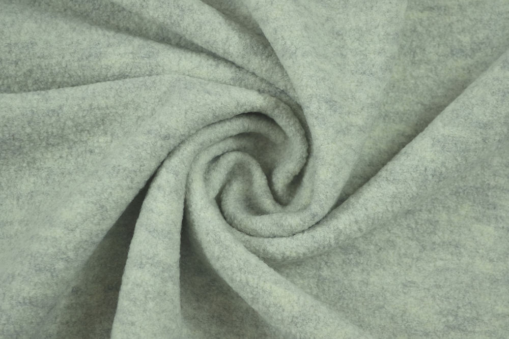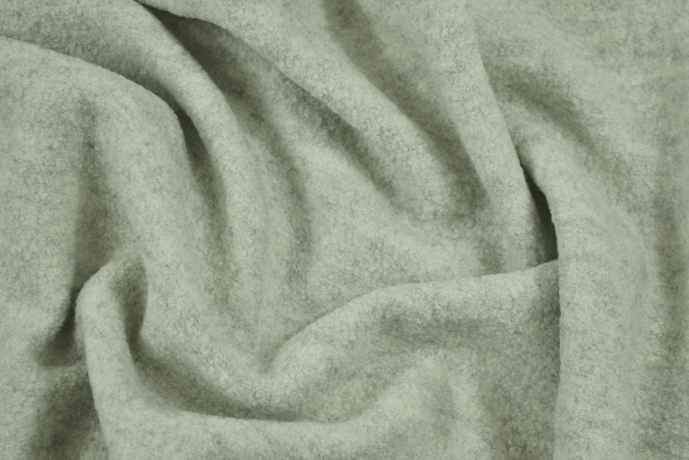 Scampolo di 3 metri di Lana cotta bouclée in pura lana color grigio chiaro mélange, grigio screziato. Maglia di lana spessa, ben compatta e follata, pur rimanendo MORBIDA, con la caratteristica superficie a "ricciolini" del bouclé.