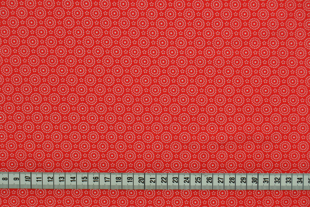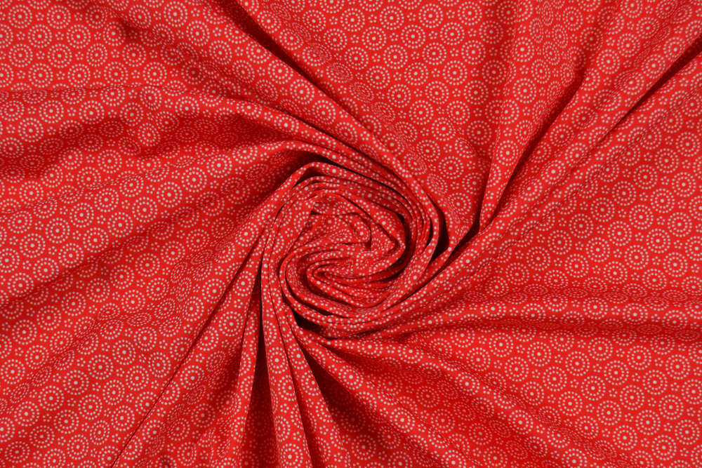 Lycra opaca stampata rossa con piccoli cerchi in bianco. Tessuto bi-stretch adatto per innumerevoli creazioni: vestiti aderenti, abbigliamento sportivo, spettacolo, danza, pattinaggio, costumi da bagno, ecc..