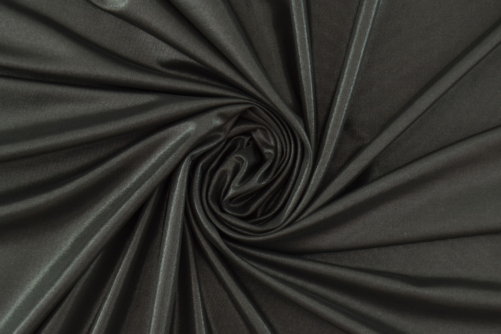 Jersey di viscosa elasticizzato nero con superficie lucida, che crea un effetto metallizzato. Tessuto elasticizzato, morbido e confortevole, adatto per innumerevoli creazioni: vestiti aderenti oppure larghi e fluidi, top, canotte, beachwear, abbigliamento per spettacolo, pattinaggio, danza ecc..