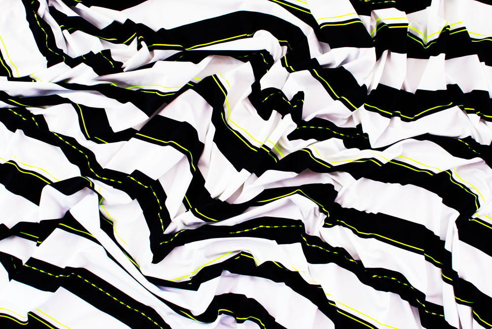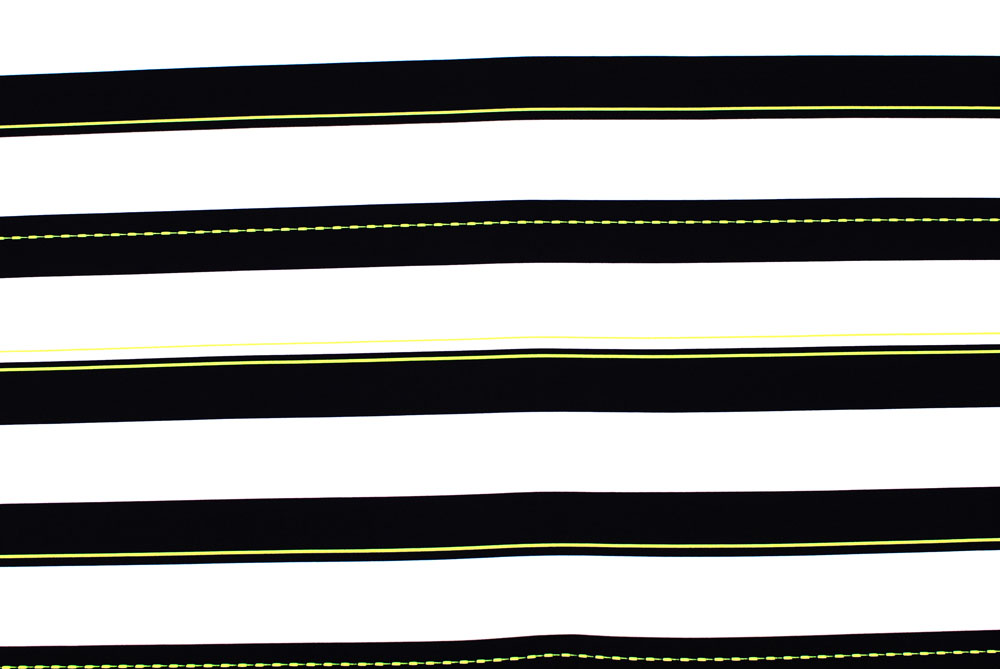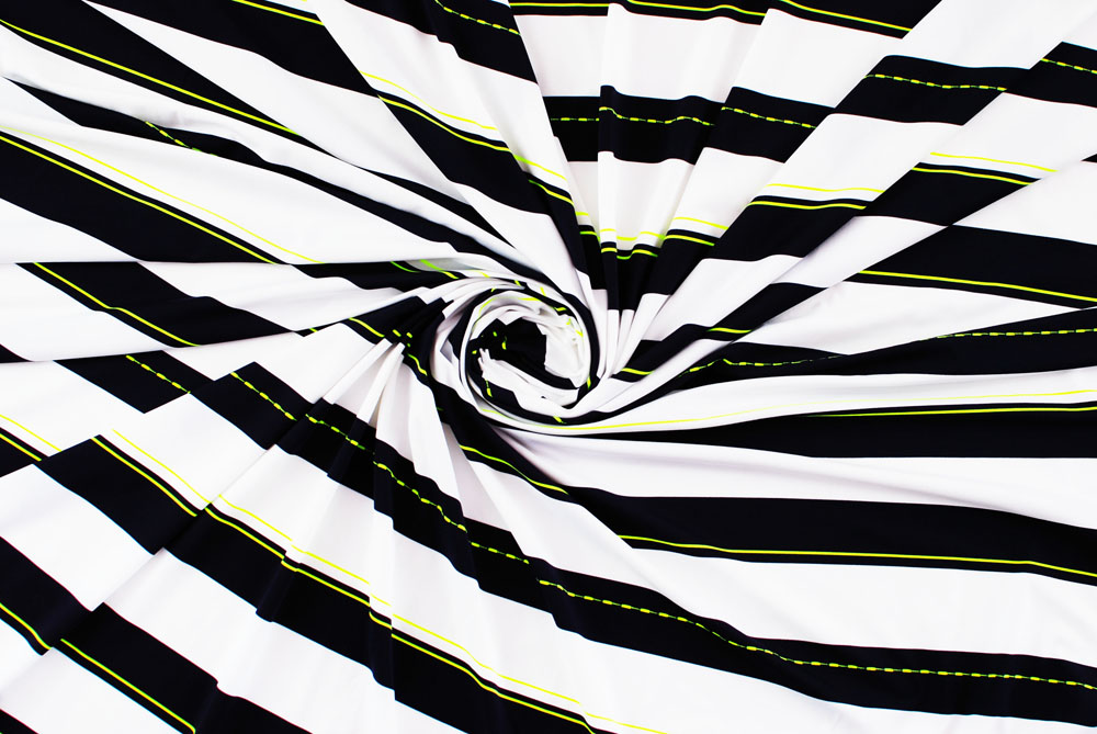 Lycra di ottima qualità, colore bianco con grandi strisce nere e piccole righe giallo fluo. Adatta per innumerevoli creazioni: costumi da bagno, vestiti aderenti, abbigliamento sportivo, danza, ecc. ecc.. Ben coprente.