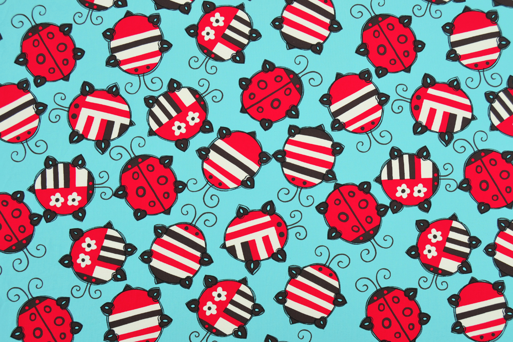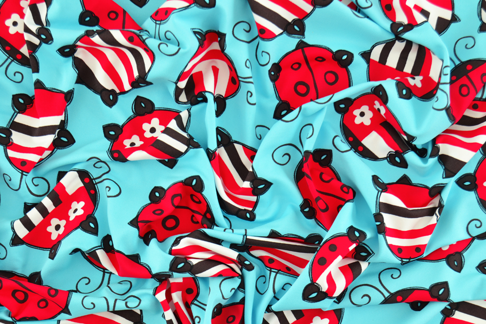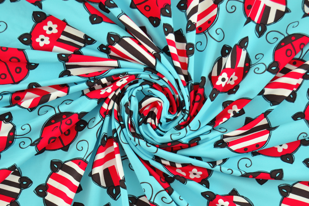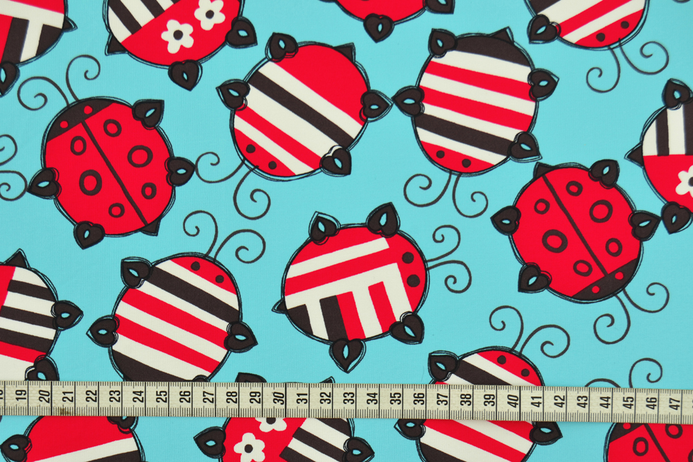 Lycra morbida turchese con fantasia di coccinelle rosse. Tessuto bi-stretch, bi-elastico, molto morbido e confortevole a contatto con la pelle, adatto per innumerevoli creazioni: vestiti aderenti o ampi, body, leggings, abbigliamento sportivo, danza, pattinaggio, costumi da bagno, ecc..