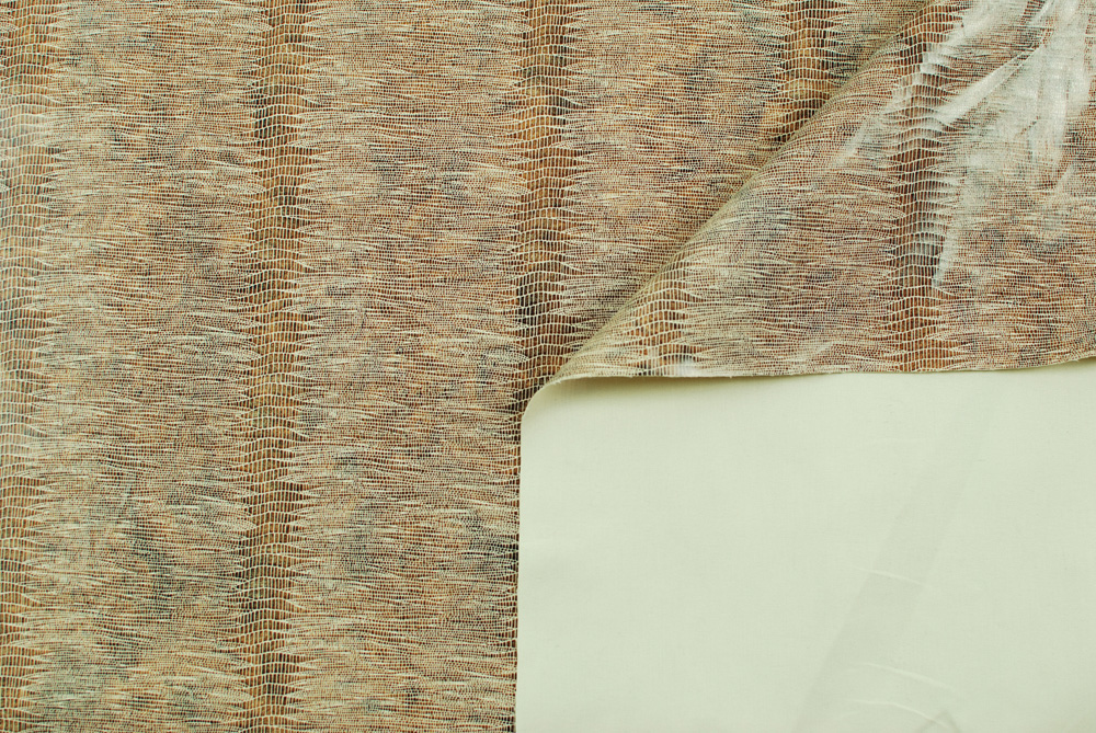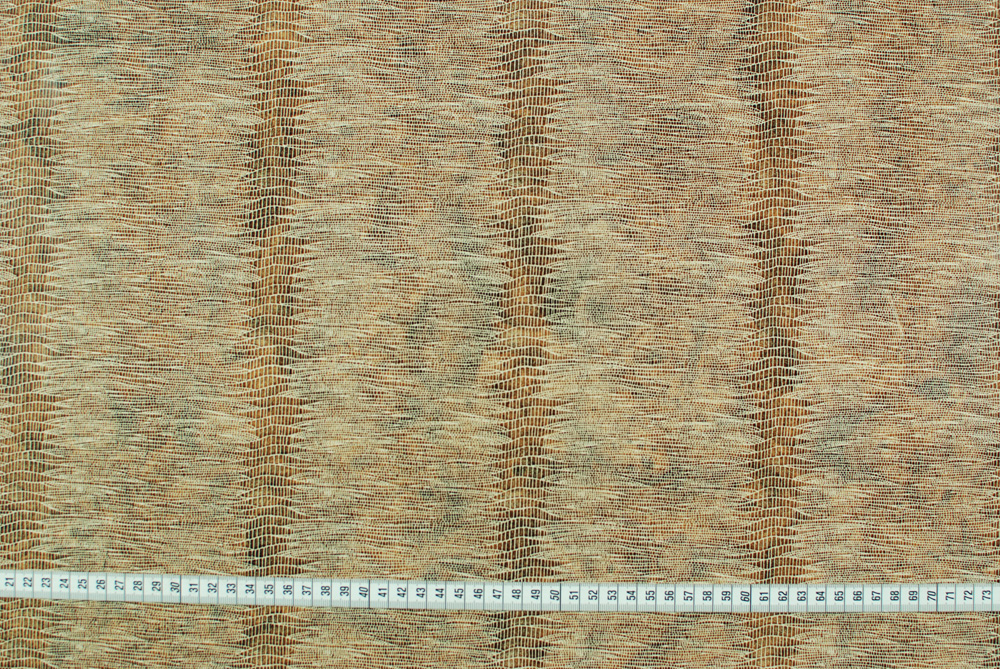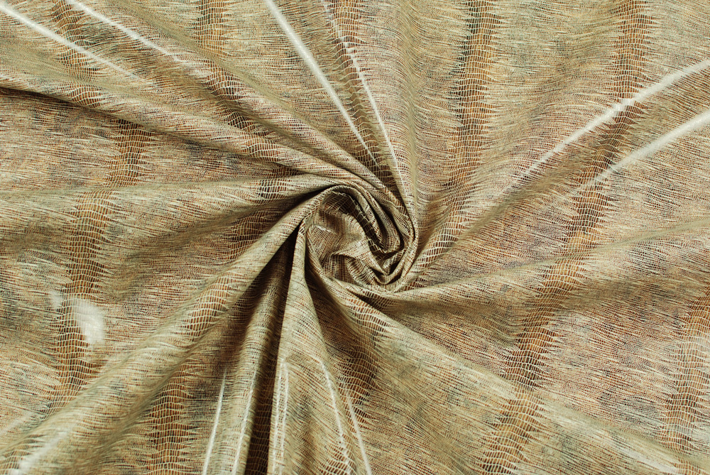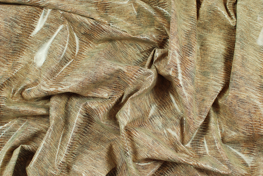 Tessuto di cotone spalmato con superficie lucida a imitazione pelle di rettile, color marrone chiaro.