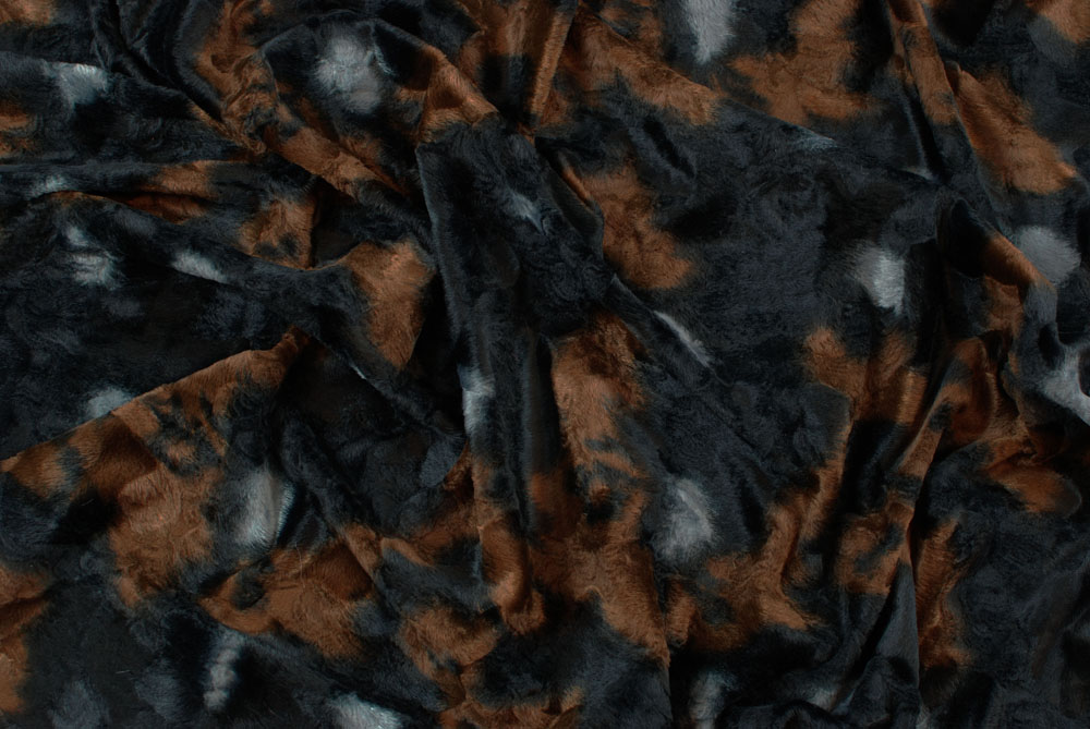 Pelliccia sintetica imitazione cavallino a pelo rasato nero con macchie marroni e grigie, motivo animalier pezzato.