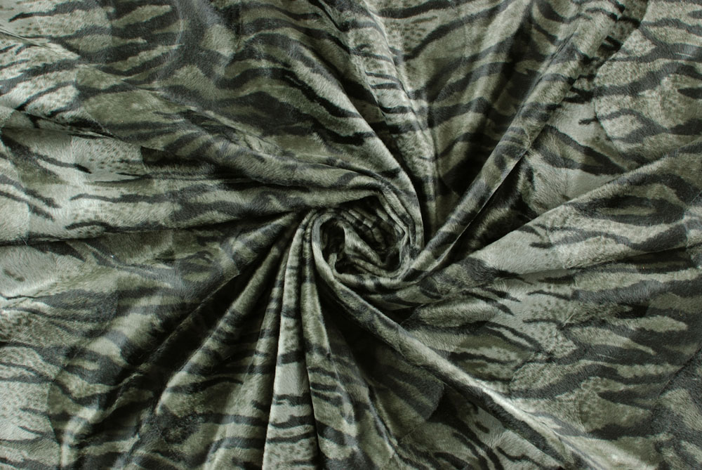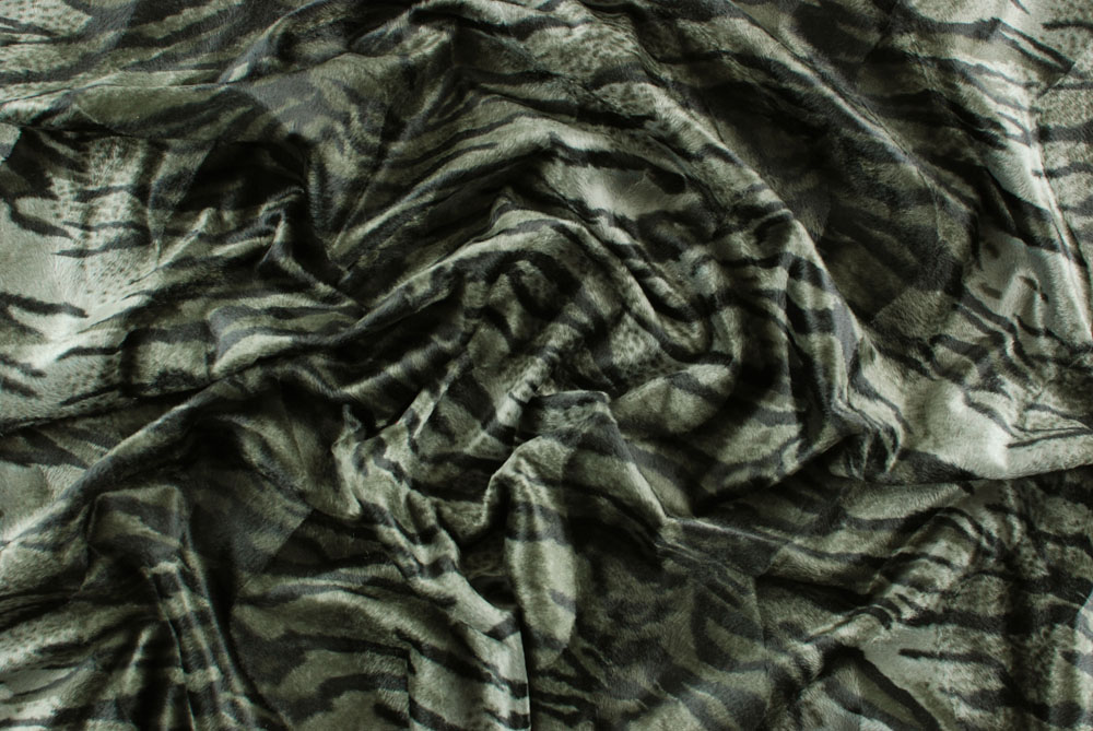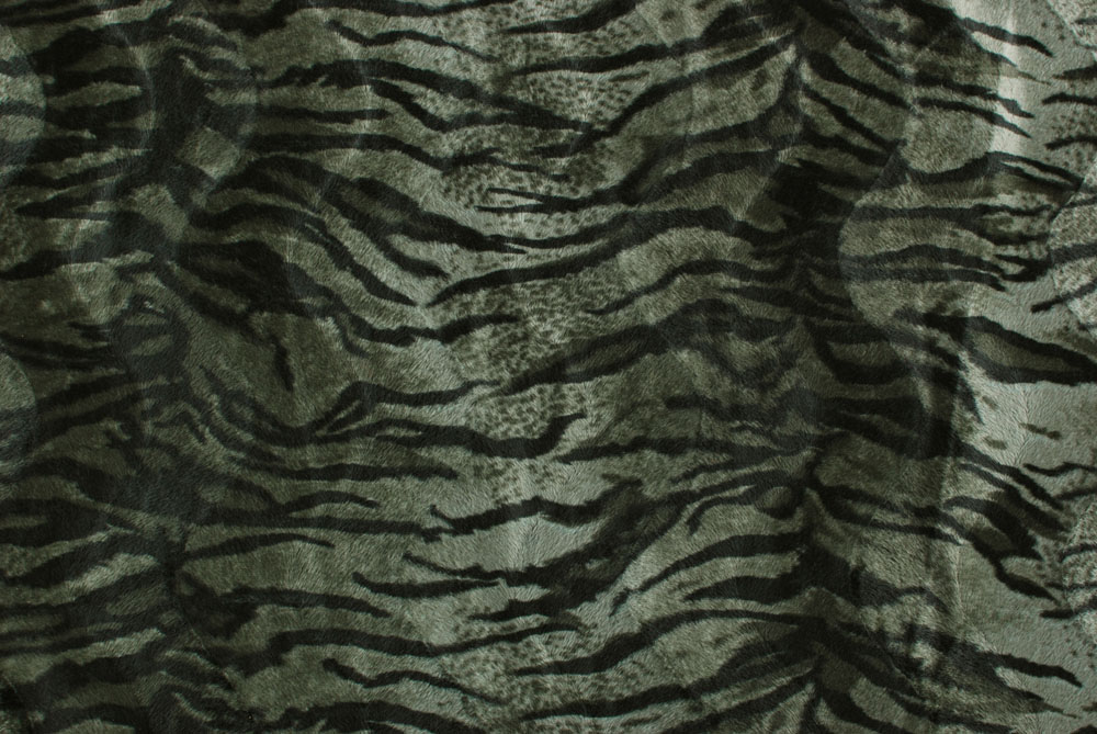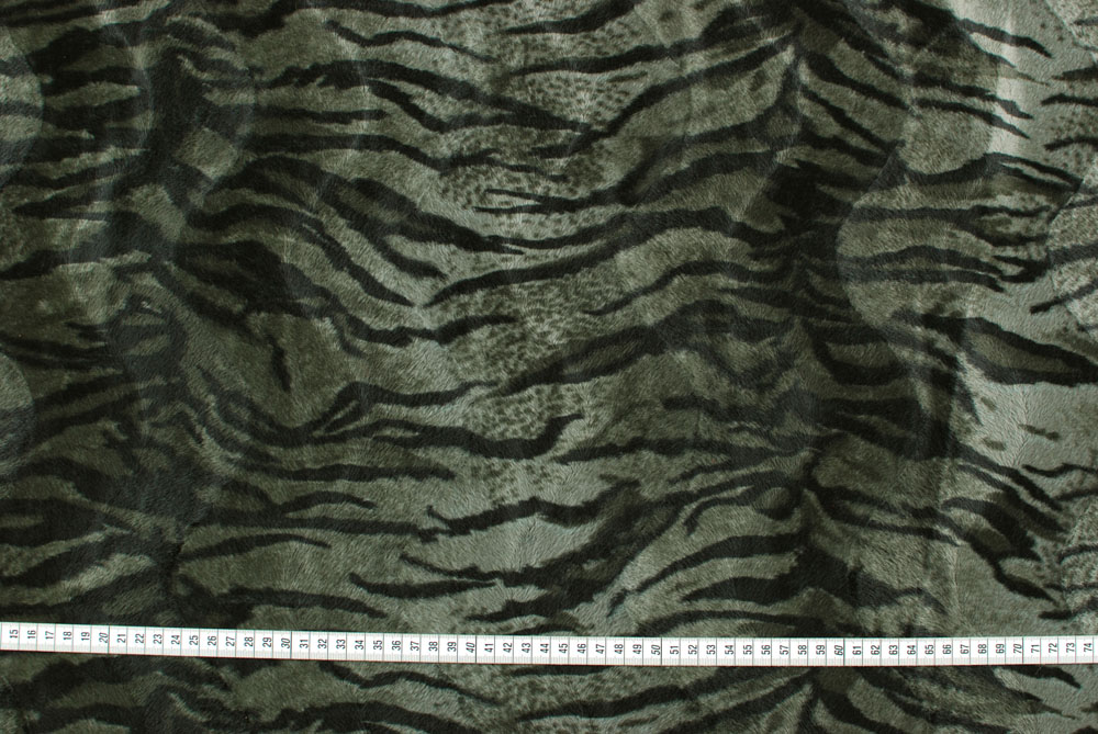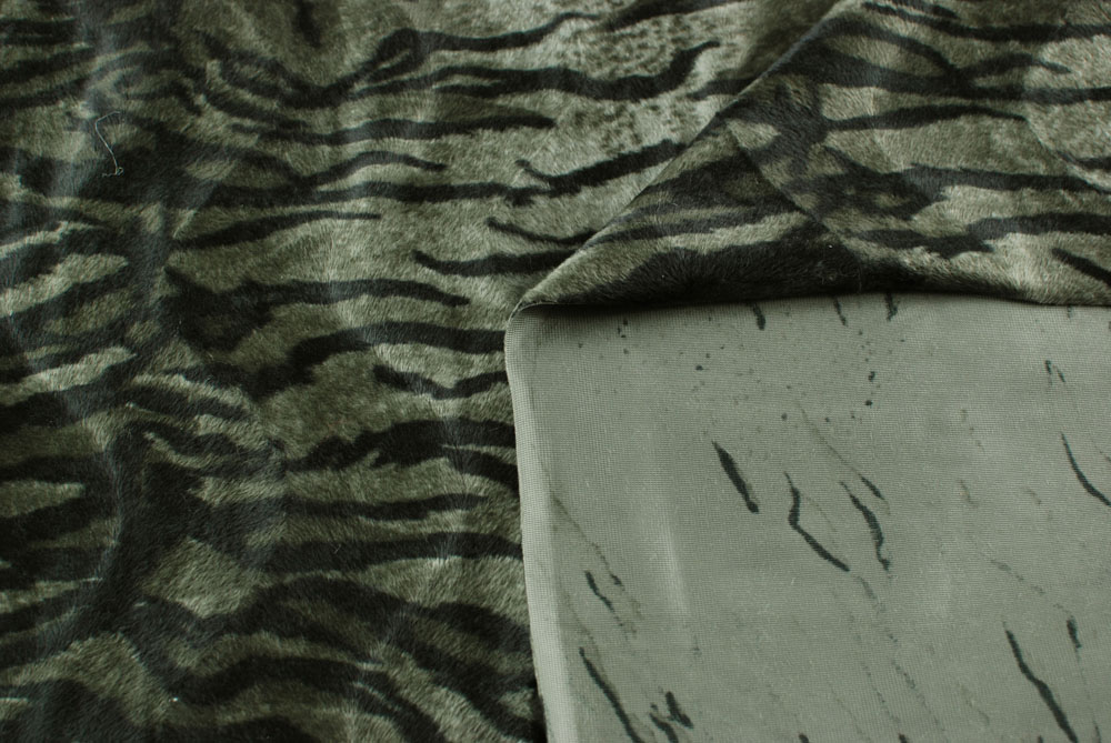 Finta pelliccia tigrata sui toni del verde militare, kaki scuro.