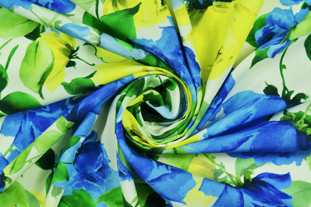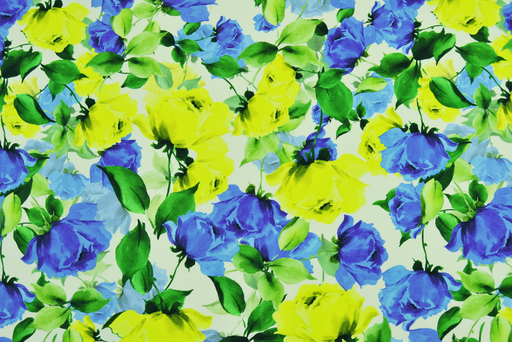 Scopri questo meraviglioso tessuto in viscosa color bianco panna con una vivace stampa floreale con rose blu e gialle accompagnate da foglie verdi.