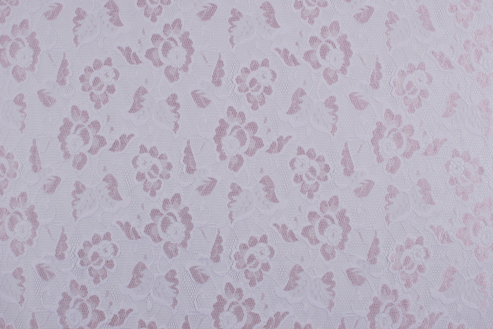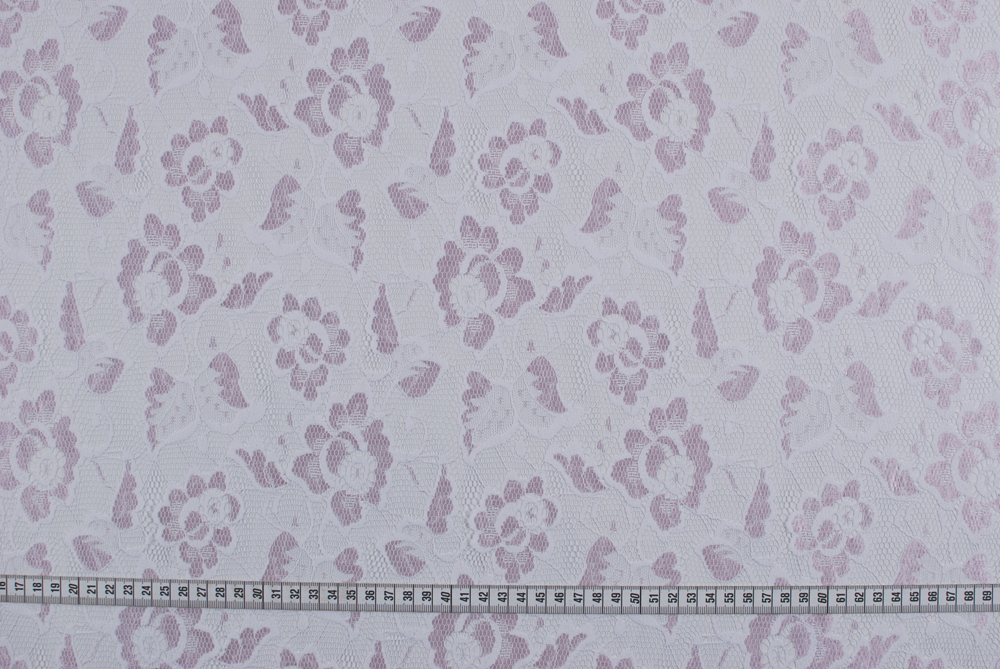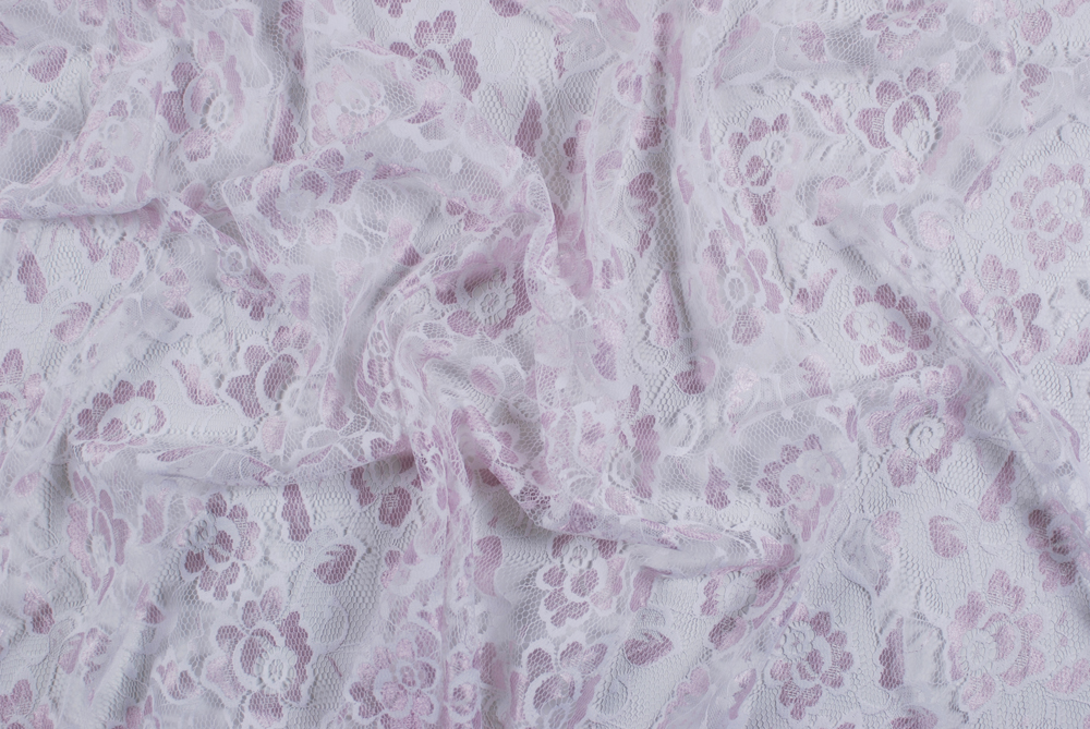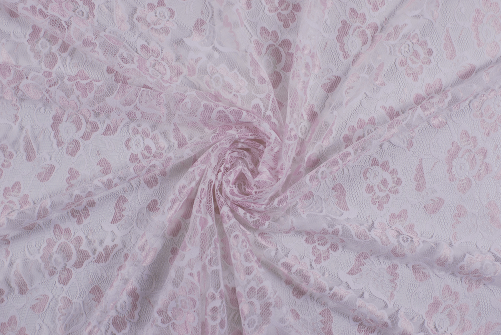 Delicato pizzo bicolore a rete con base bianca e motivo floreale rosa chiaro.