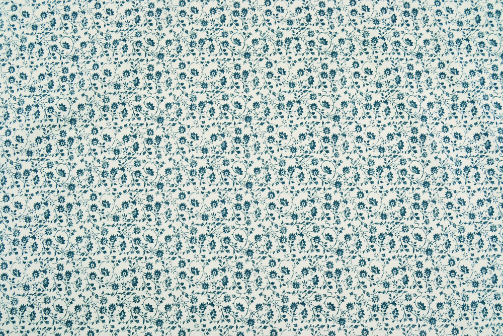 Tessuto in cotone leggermente elasticizzato bianco panna con fantasia a fiori blu polvere. Tessuto manopesca, cioè leggermente scamosciato al tatto.
