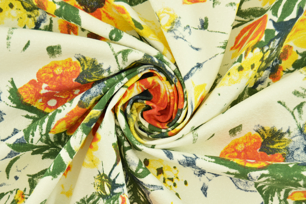 Tessuto in cotone elasticizzato bianco panna con lavorazione jacquard che dona una texture a rilievi alla superficie, con stampa floreale.