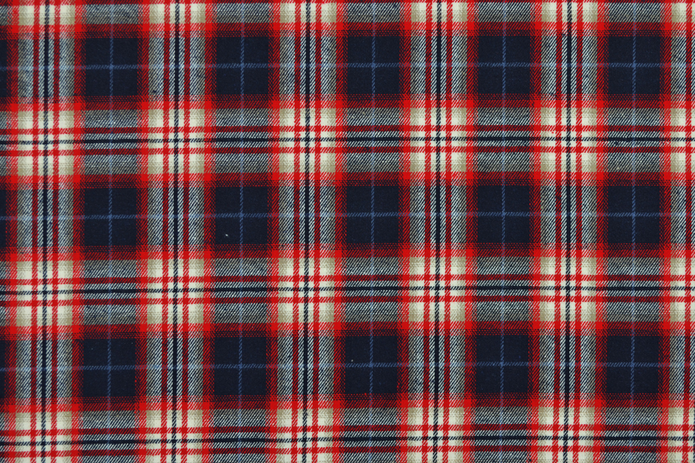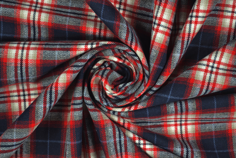 Tessuto twill in flanella di puro cotone con motivo a quadri tartan scozzese in tinto filo in rosso, bianco e blu.