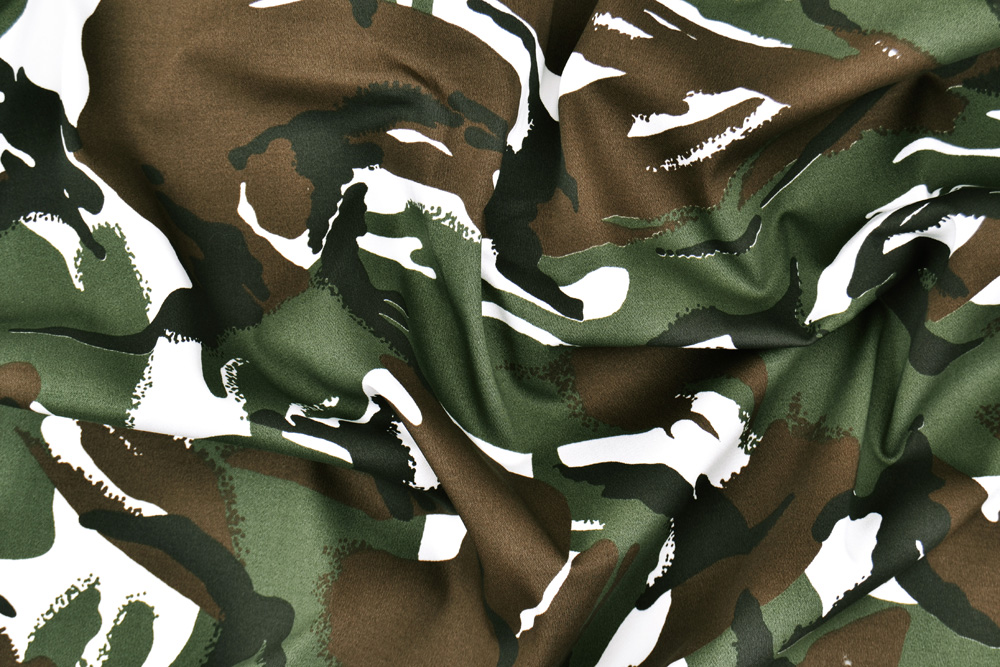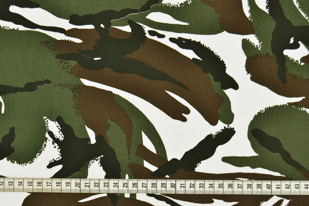 Tessuto drill di cotone elasticizzato con fantasia mimetica in verde militare, marrone e nero su base bianca. Tessuto di medio peso, elasticizzato e molto comodo.