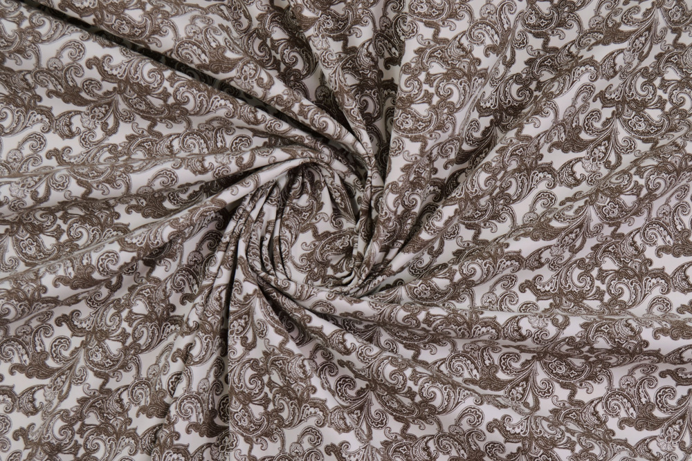 Scampolo di 3 metri di Tessuto in cotone leggermente elasticizzato, bianco panna con fantasia di ispirazione barocca in marrone. Tessuto robusto, ma di mano morbida. "Manopesca", cioé dal tocco leggermente vellutato, molto gradevole al tatto.