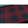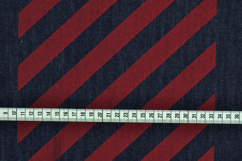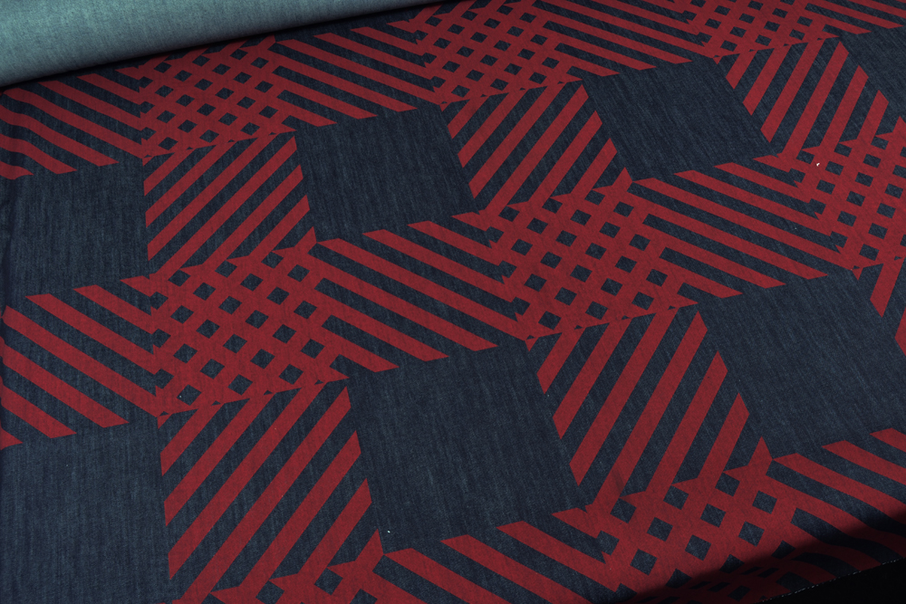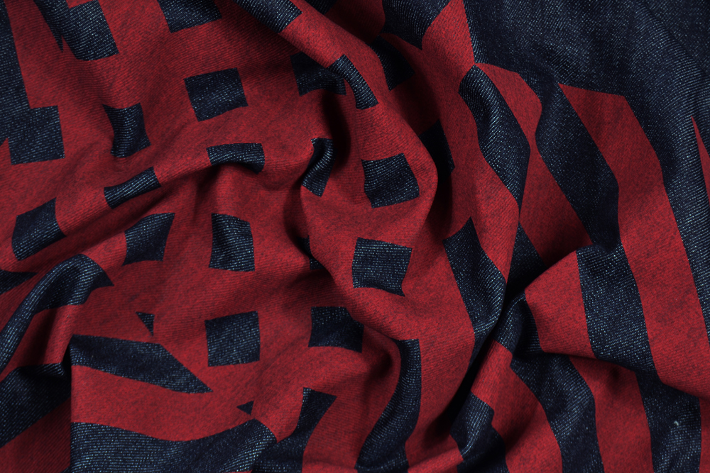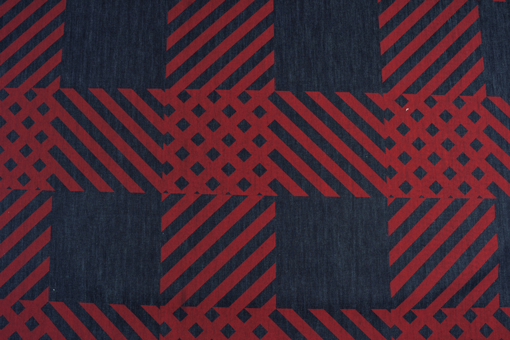 Scampolo di 3 metri di Tessuto denim di cotone blu, con stampa a quadri di grandi dimensioni in rosso scuro, rosso granata.