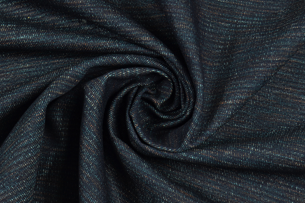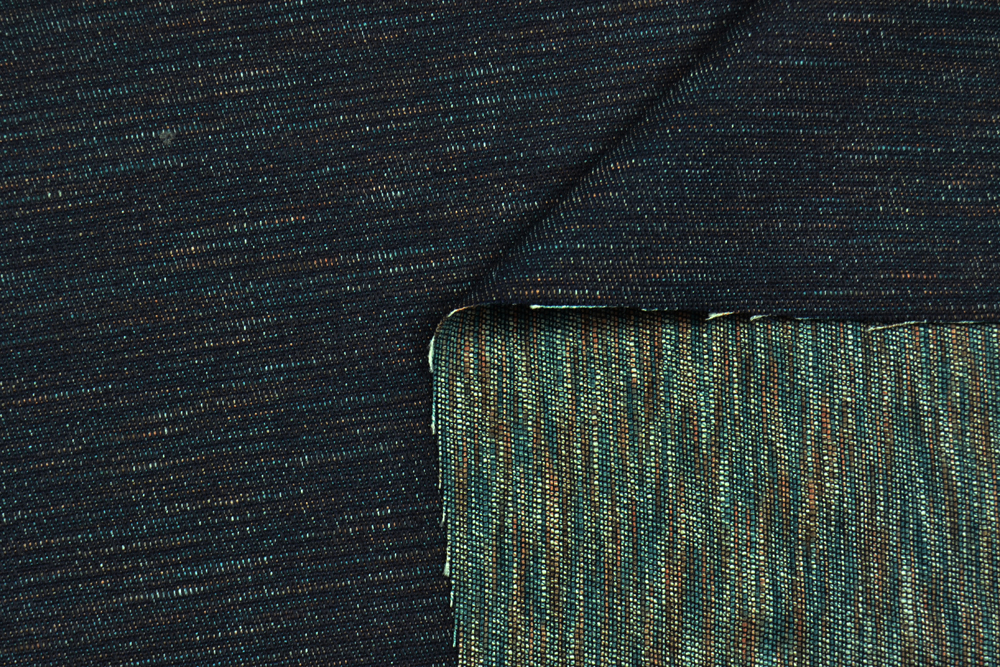Tessuto denim in 100% cotone di ottima qualità. Classico colore blu indigo dei jeans, con la particolarità di avere dei fili di fondo colore rosa pesca e turchese: in questo modo il colore non è una semplice tinta unita ma è un blu con delle screziature colorate appena accennate, ben visibili sul rovescio.