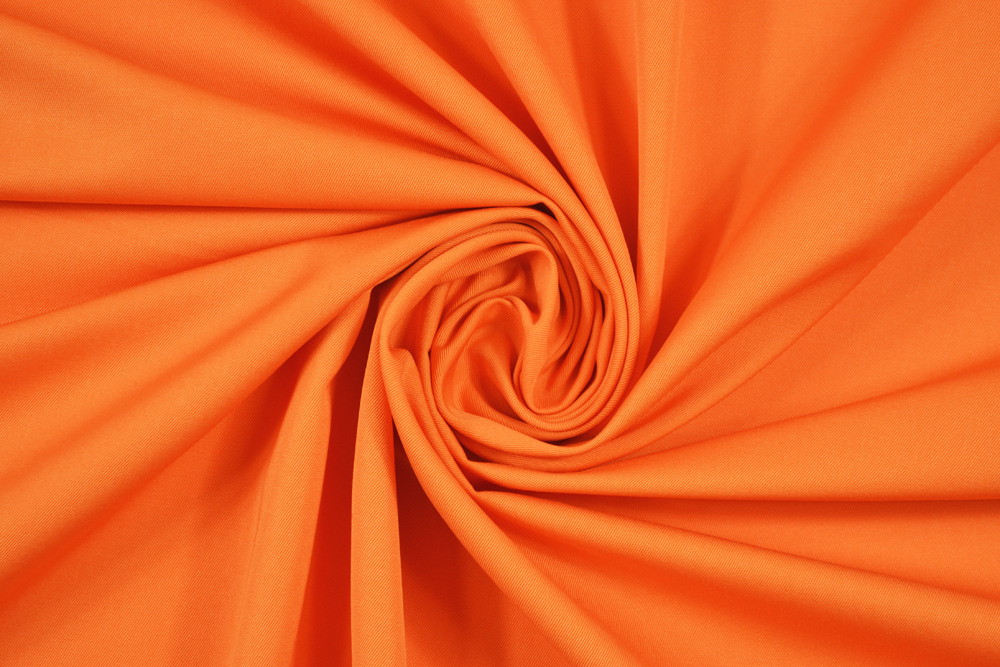 Tessuto twill in acetato, al tatto del tutto simile al cotone, colore arancione, particolarmente adatto per la creazione di pantaloni e gonne ampie, abiti, ecc..