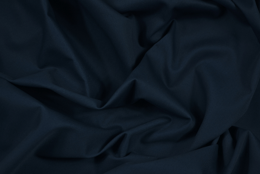 Tessuto twill in acetato, al tatto del tutto simile al cotone, colore blu navy, particolarmente adatto per la creazione di pantaloni e gonne ampie, abiti, ecc..