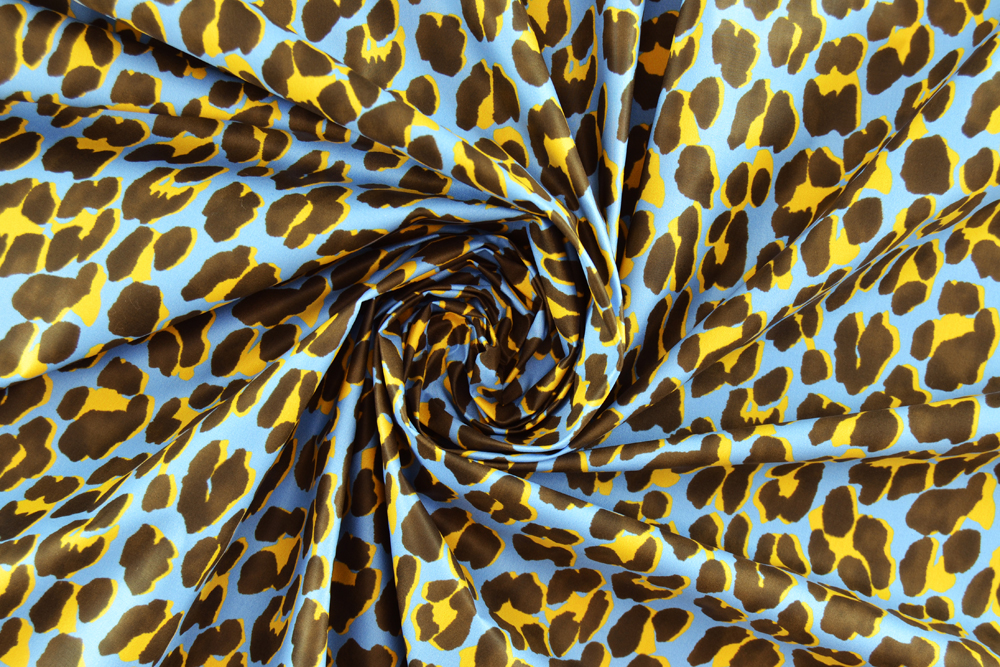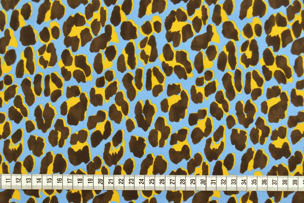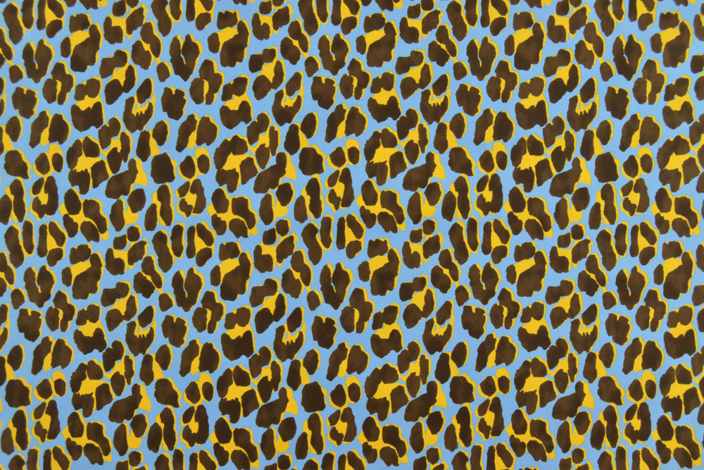 Tessuto in puro cotone con trattamento idrorepellente che rende la superficie leggermente cerata. Fantasia animalier leopardata in marrone e giallo su fondo azzurro. Cotone sottile e leggero ma ben resistente.