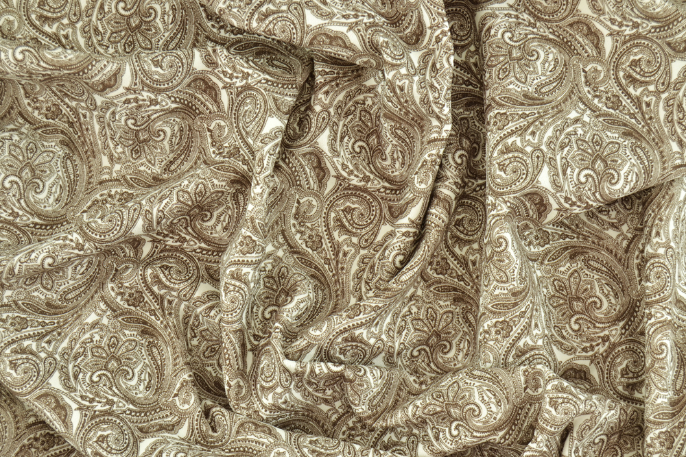 Vellutino di cotone stampato con ricchissima fantasia ramage di ispirazione barocca in marrone su fondo bianco panna.