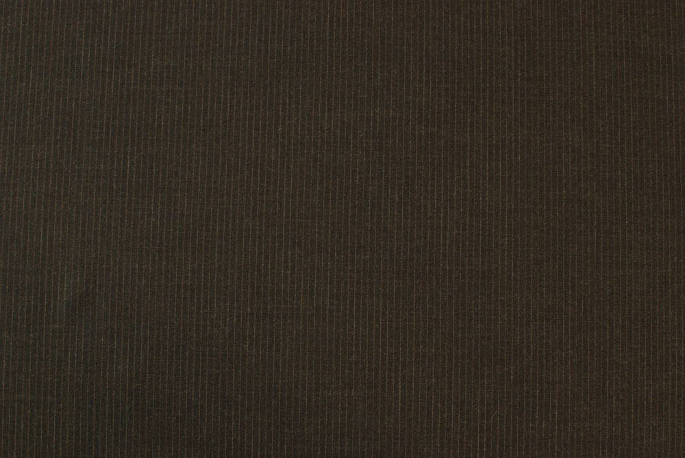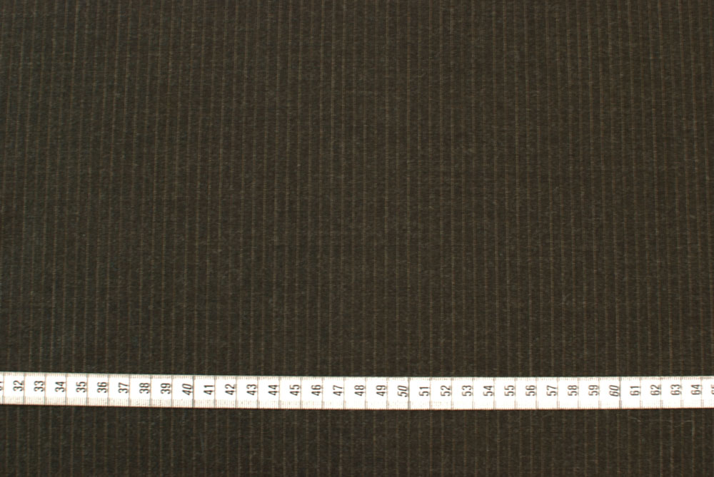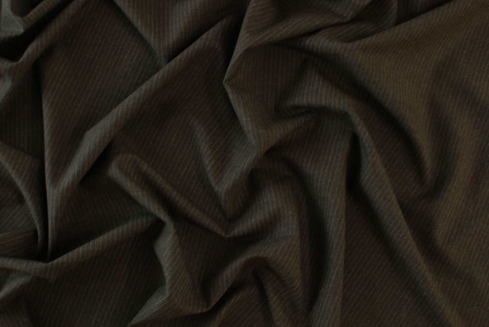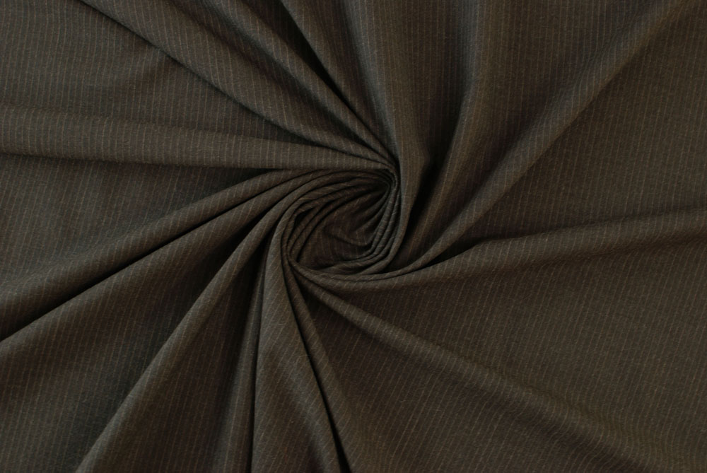 Tessuto pettinato di lana stretch marrone scuro con sottili righine in marrone più chiaro. Elasticizzato.