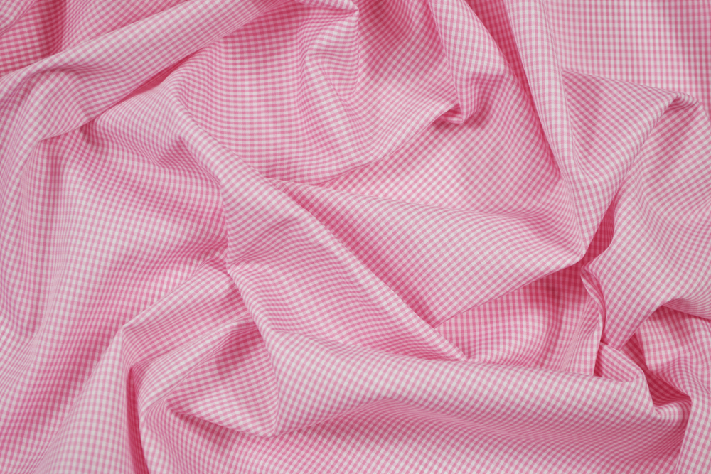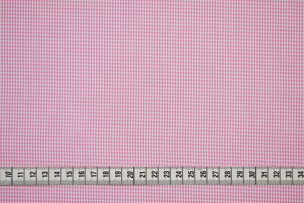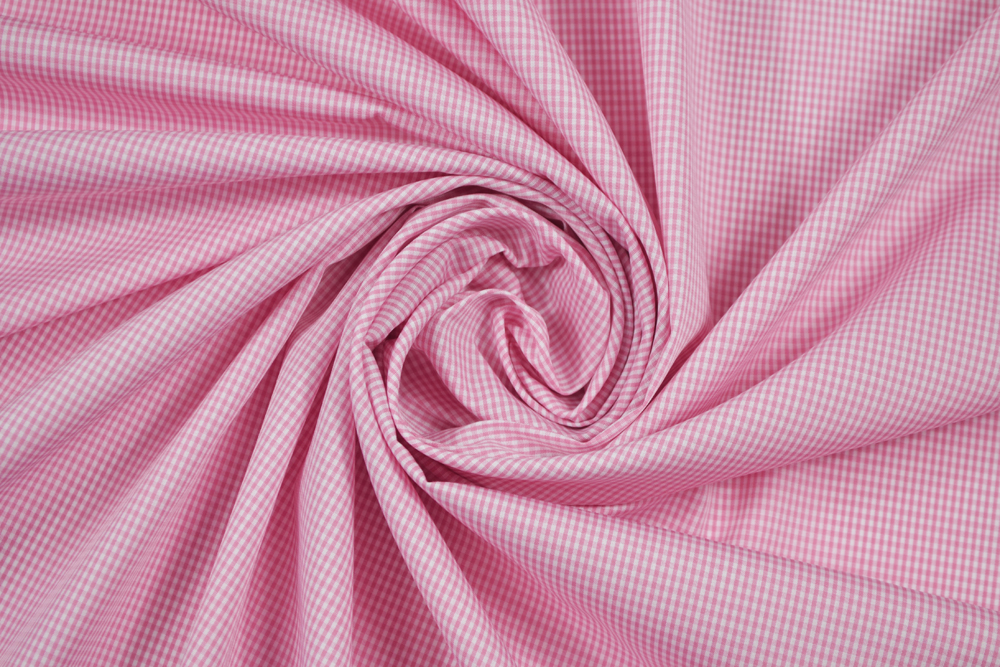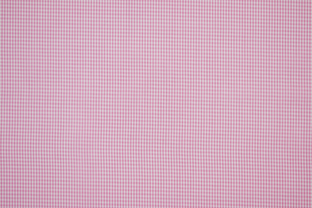 Tessuto per camiceria popeline in puro cotone bianco a micro-quadretti rosa in tinto filo. Altissima qualità. Tessuto leggero ma coprente, fresco e morbido.