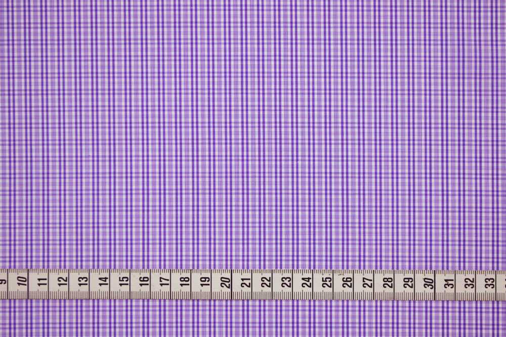 Tessuto popeline per camiceria in puro cotone di altissima qualità, bianco a quadretti vinaccia in tinto filo. Tessuto leggero ma coprente, fresco e morbido.