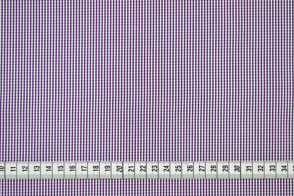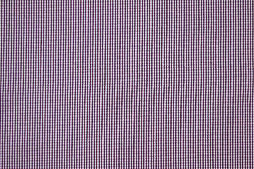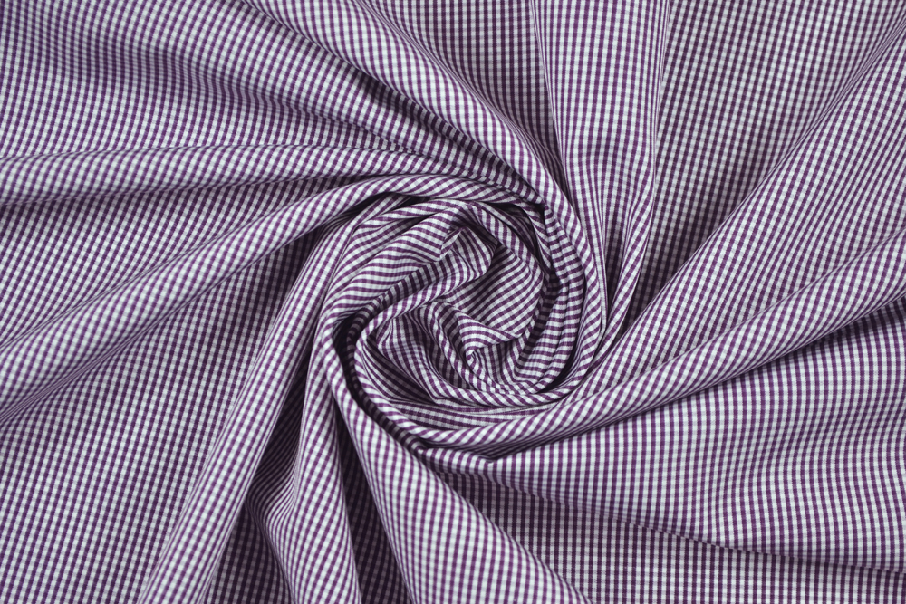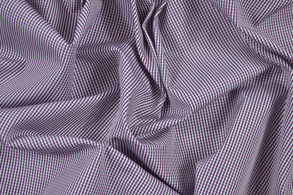 Tessuto popeline in puro cotone di medio peso, bianco a micro-quadretti viola in tinto filo. Tessuto non troppo leggero, con trama fitta e compatta, di mano frusciante.