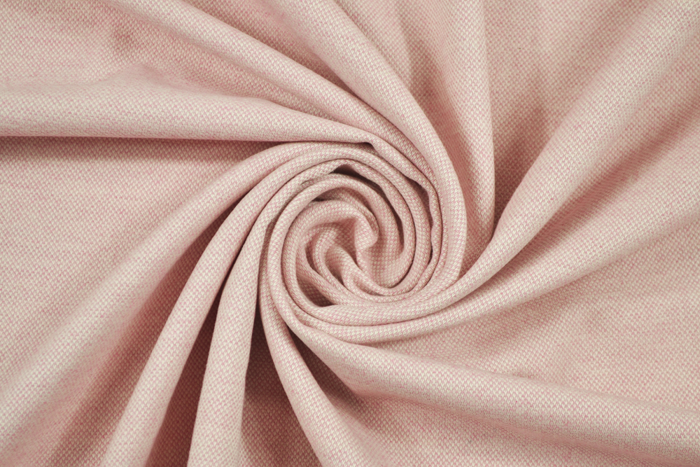 Tessuto Oxford in caldo cotone, pepe e sale rosa/bianco. La sua particolarità è di avere i fili d'ordito e i fili di trama di colori diversi, rosa e bianco, cosa che accentua l'effetto d'intreccio a cestino formando una minuscola quadrettatura. Adatto per abbigliamento in stile classico casual.