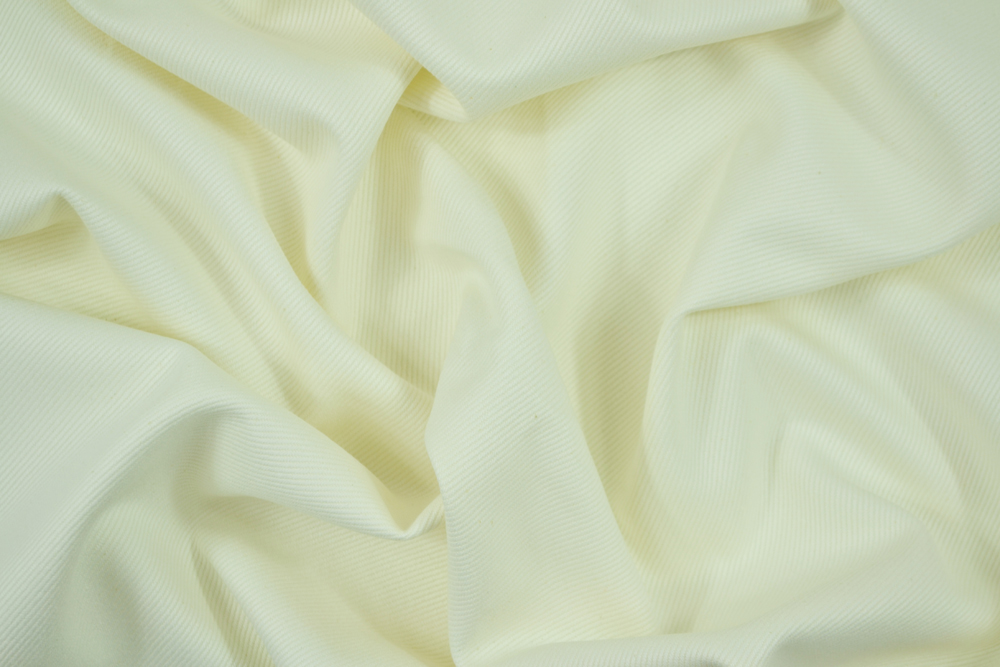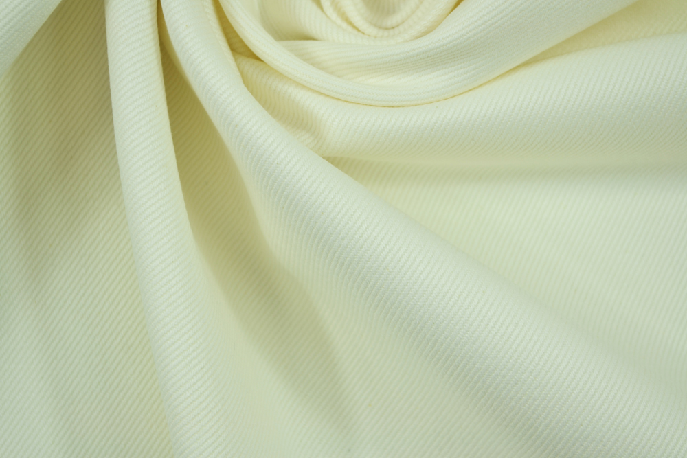 Tessuto drill di puro cotone color bianco panna. La sua armatura a levantina (con costine diagonali evidenti) lo rende particolarmente robusto e resistente.