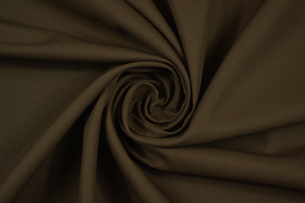 Tessuto drill di puro cotone color marrone cioccolato. La sua armatura a levantina (con costine diagonali evidenti) lo rende particolarmente robusto e resistente.