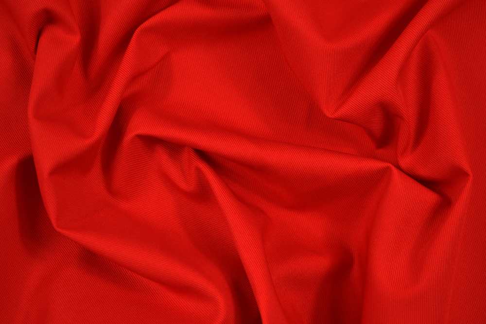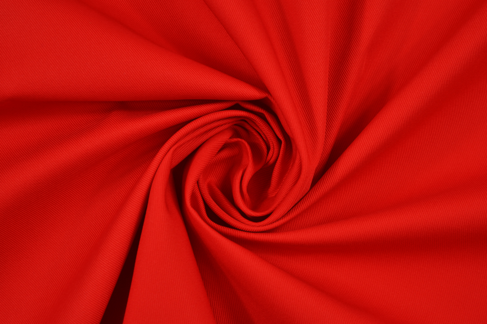 Tessuto drill in misto cotone rosso. La sua armatura a levantina (con costine diagonali evidenti) lo rende particolarmente robusto e resistente.