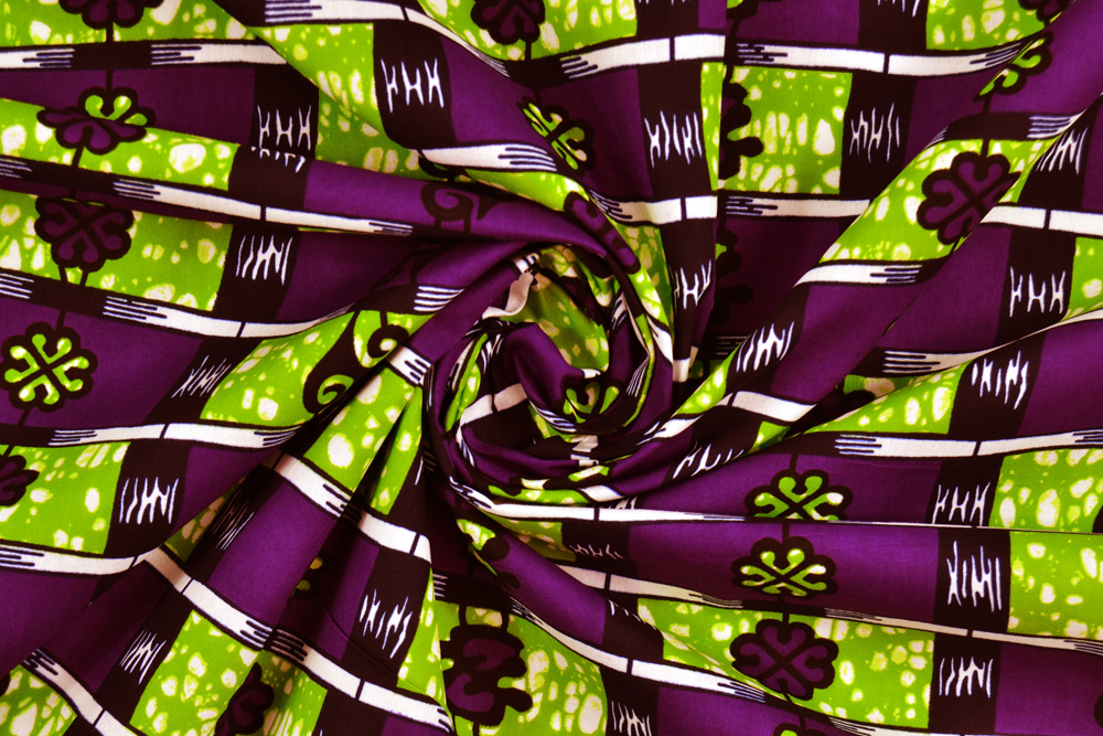 Tessuto di importazione in cotone con stampa wax ispirazione africana con fantasia a rettangoli viola e verdi con all'interno delle decorazioni di color contrastante.