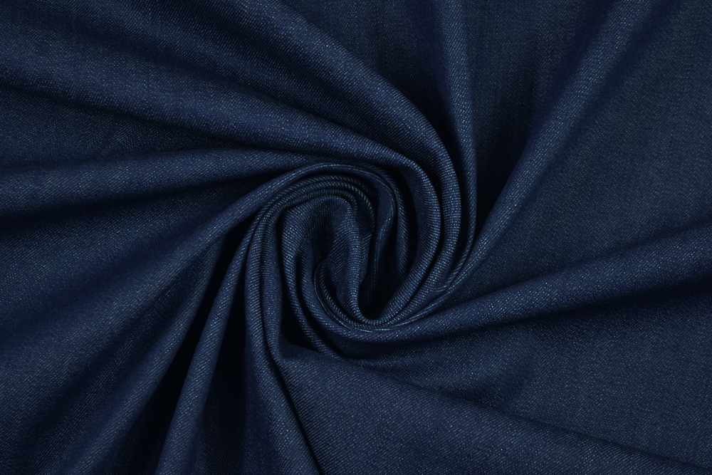 Tessuto denim di cotone stretch blu. Elasticizzato, molto morbido e comodo da indossare.