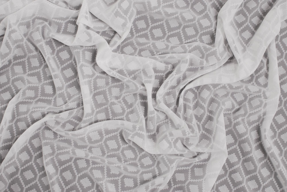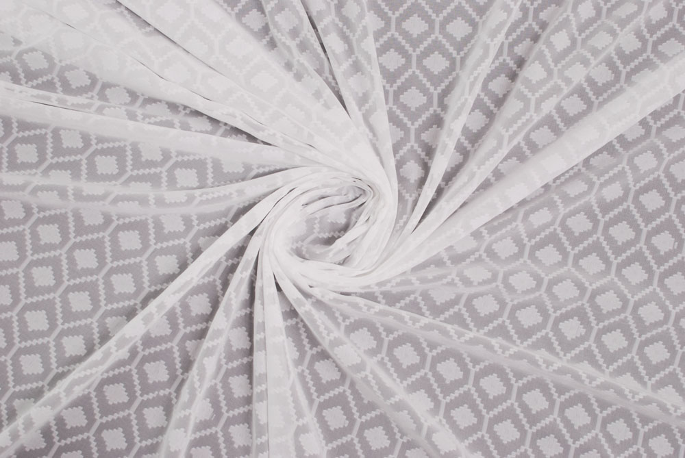 Leggerissimo tessuto trasparente bianco panna con superficie dévorée a creare un motivo geometrico in rilievo, tono su tono. Il tessuto è leggero e vaporoso, morbido e gradevole. Più coprente nella parte della fantasia e più trasparente negli spazi vuoti. Tessuto sottile ma ben resistente data la composizione in poliestere.