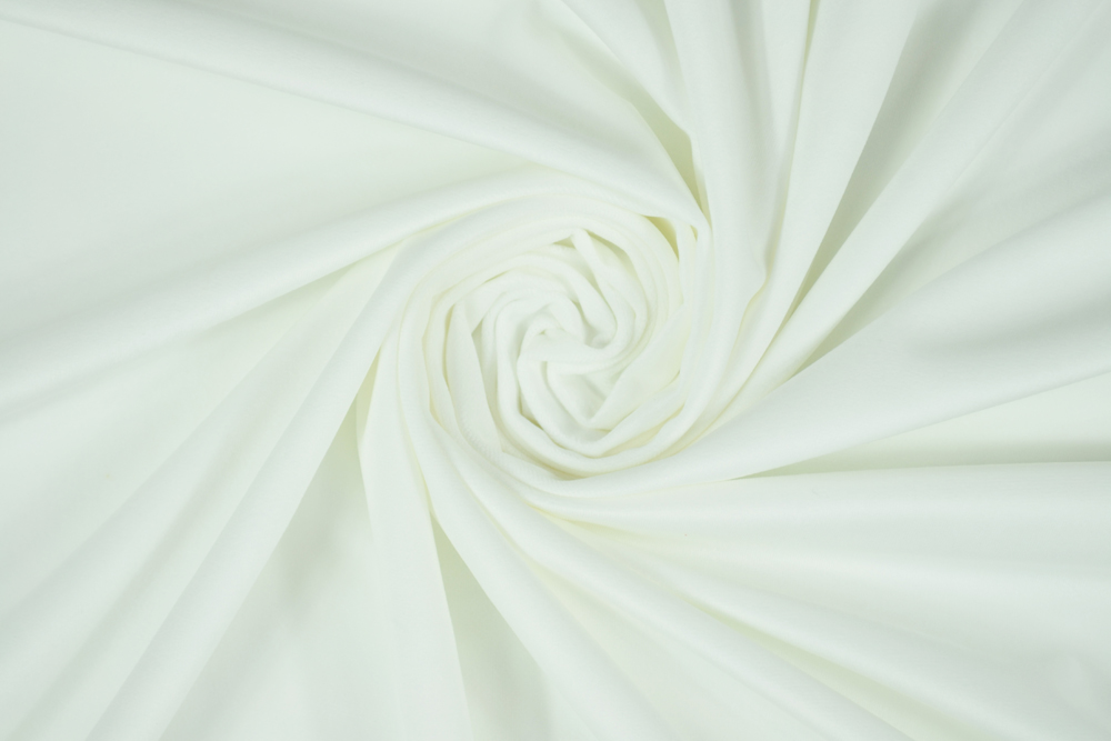 Jersey opaco bianco panna, con lato interno garzato! La parte interna garzata (cioè leggermente felpata, scamosciata) conferisce al tessuto morbidezza a contatto con la pelle e maggiore calore.