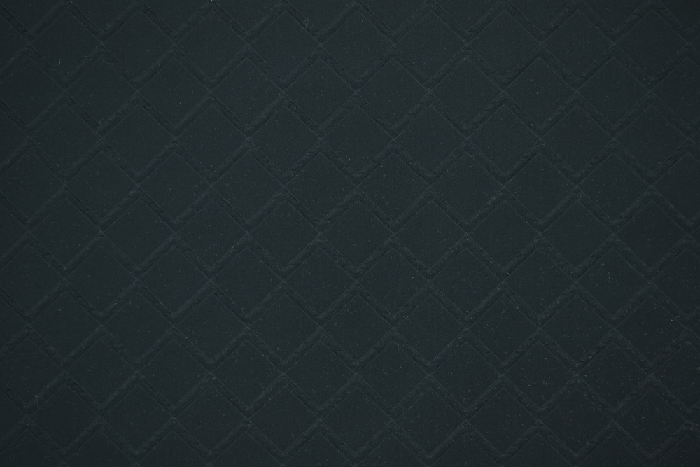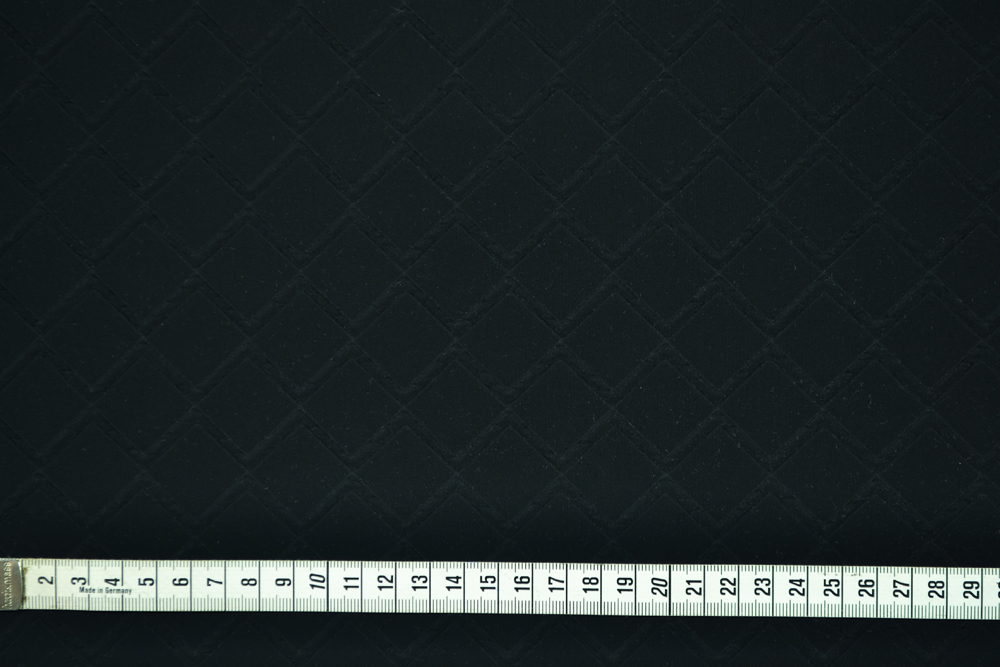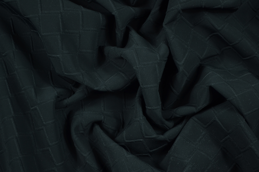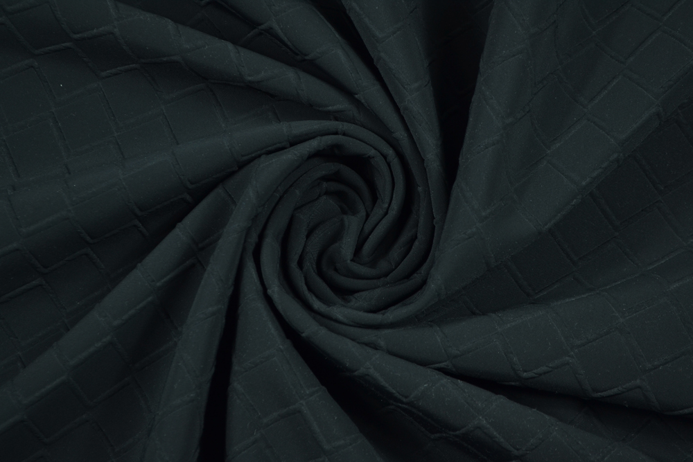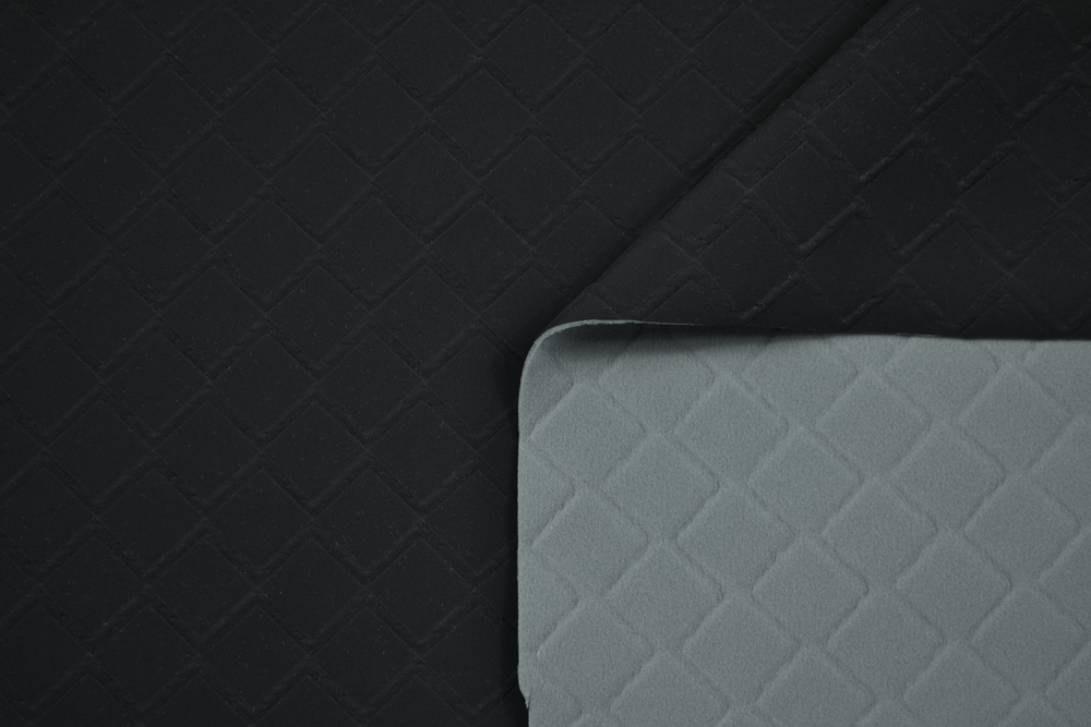 Tessuto accoppiato con spessore totale 2 mm, composto da un tessuto idrorepellente nero goffrato, con motivo a losanghe in rilievo, accoppiato sul rovescio con uno strato di pile grigio avio. Tessuto simile ad un neoprene sottile, molto morbido e di poco ingombro.